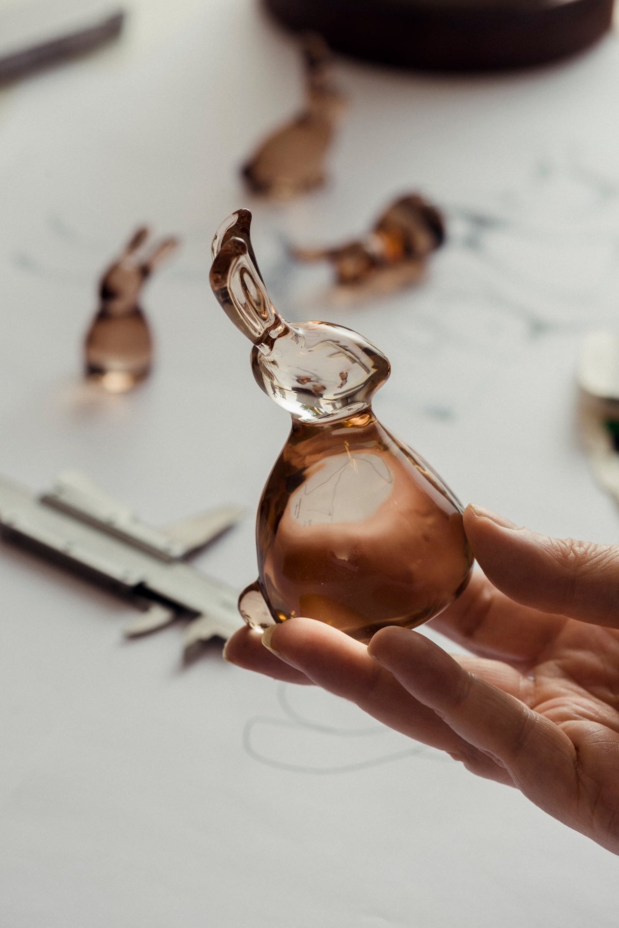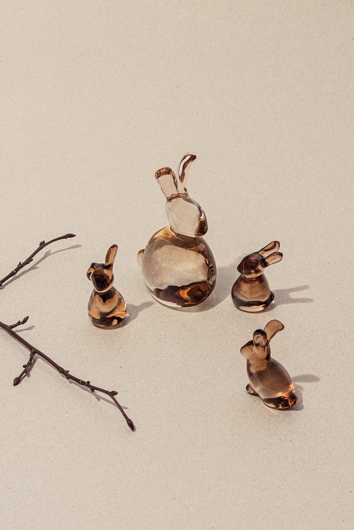 Harene er laget i kakaofarget krystallglass som gir en varm og lun tone. De små hareungene finnes både som figurer og hengepynt – like fine til påske som resten av året.