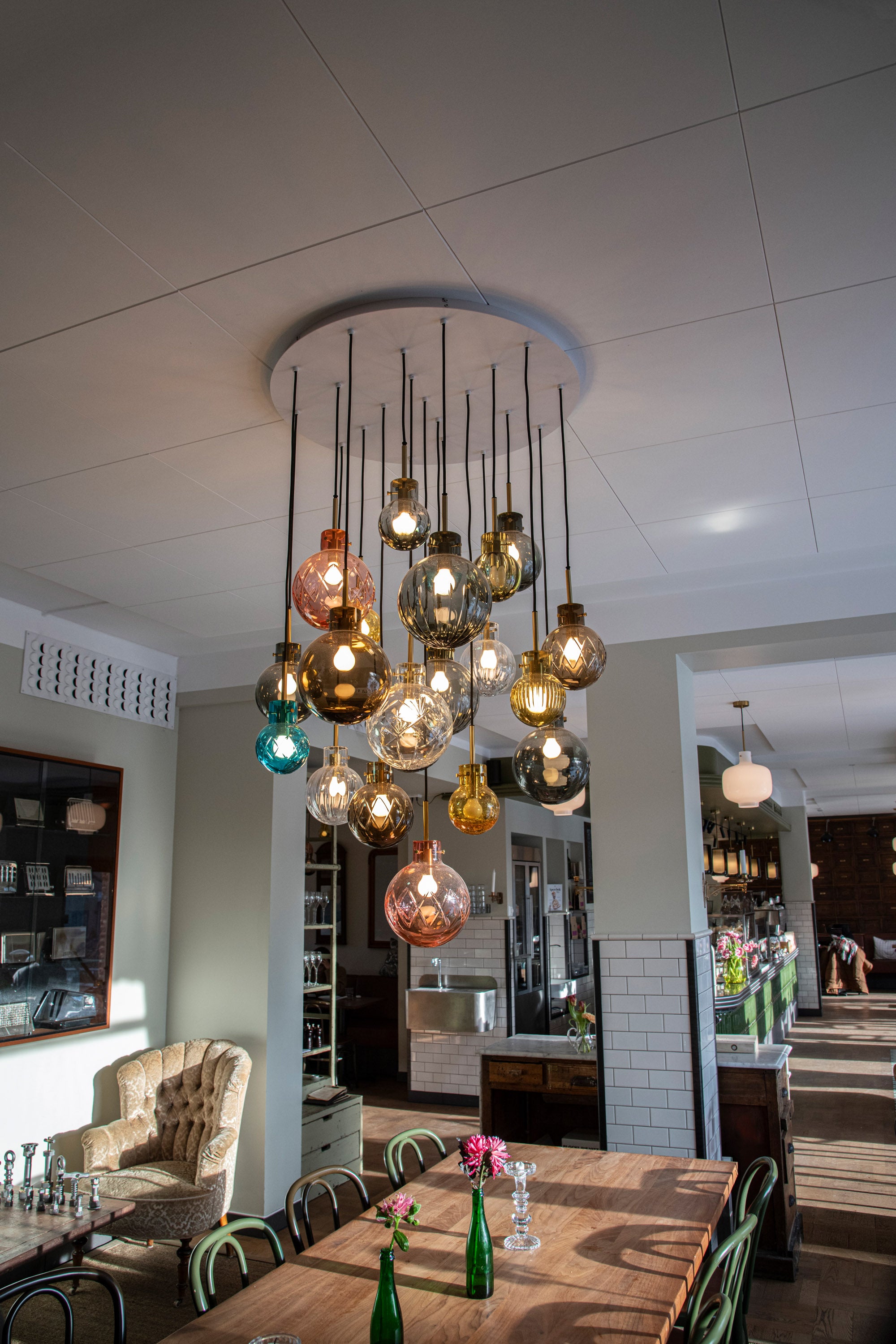Til Åpent Bakeri i Lille Tøyen Hageby har Hadeland Glassverk levert munnblåste Arkivlamper og krystallkuler.