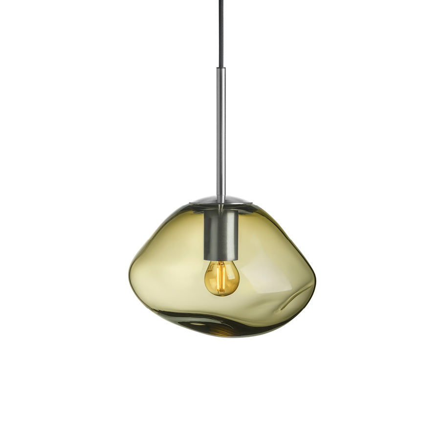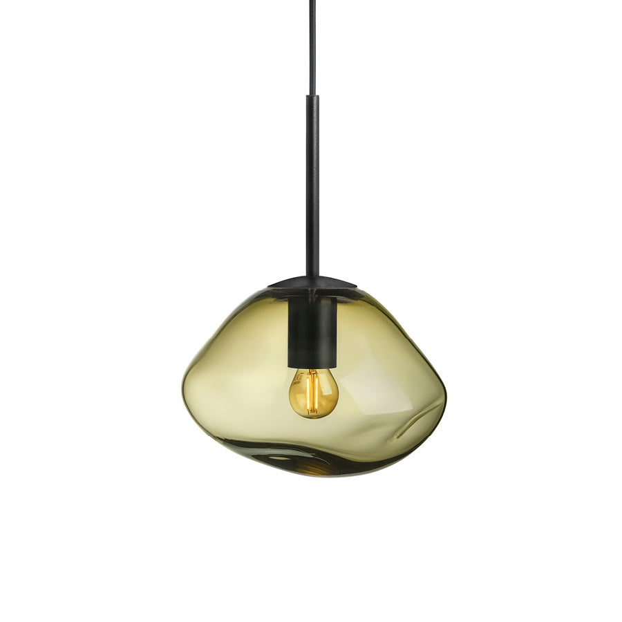 Experience a sense of calm and balance with the olive glass pendant lamp. It conjures thoughts of lush forests and moss-covered stones. Each lamp is mouth-blown and the organic shape is created while the glass is hot, making every shade unique. The olive color pairs beautifully with smoke gray, cocoa, and clear.