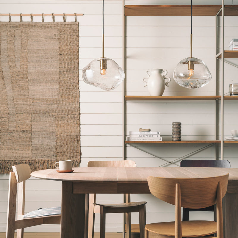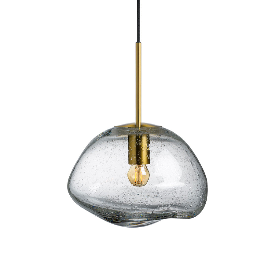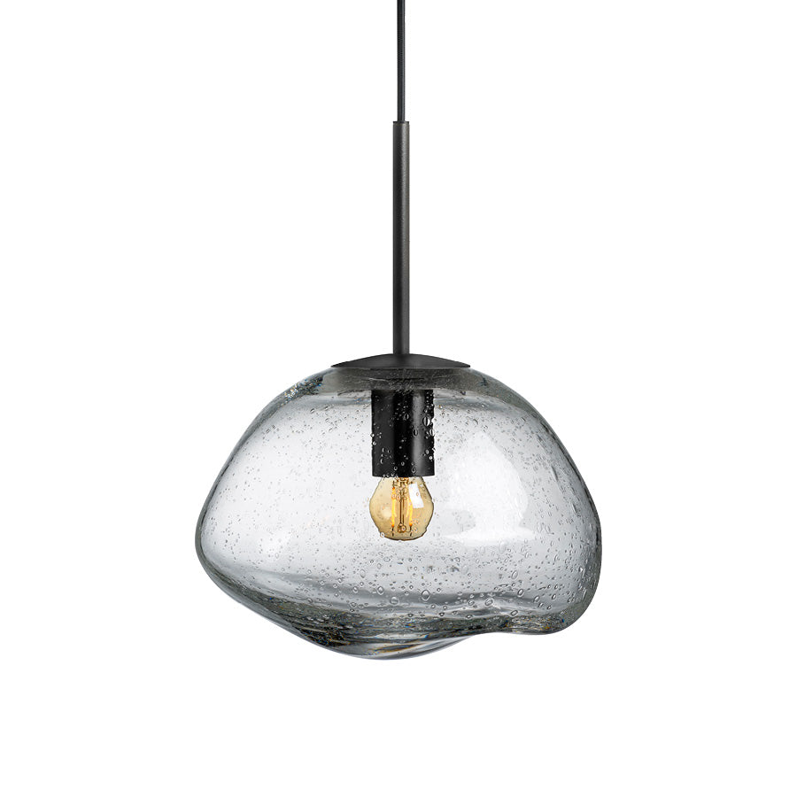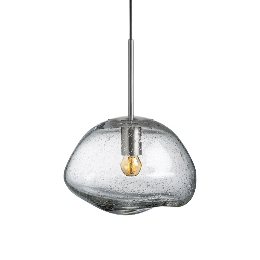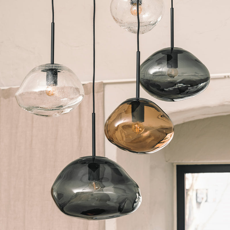 Clear soda glass pendant lamps create a stunning play of light, reminiscent of raindrops on a window or the shimmer of icicles in spring. Every lamp is mouth-blown, and the organic shape is formed while the glass is hot, making each shade truly unique. The clear color is easy to combine with any of the other colors in the series.