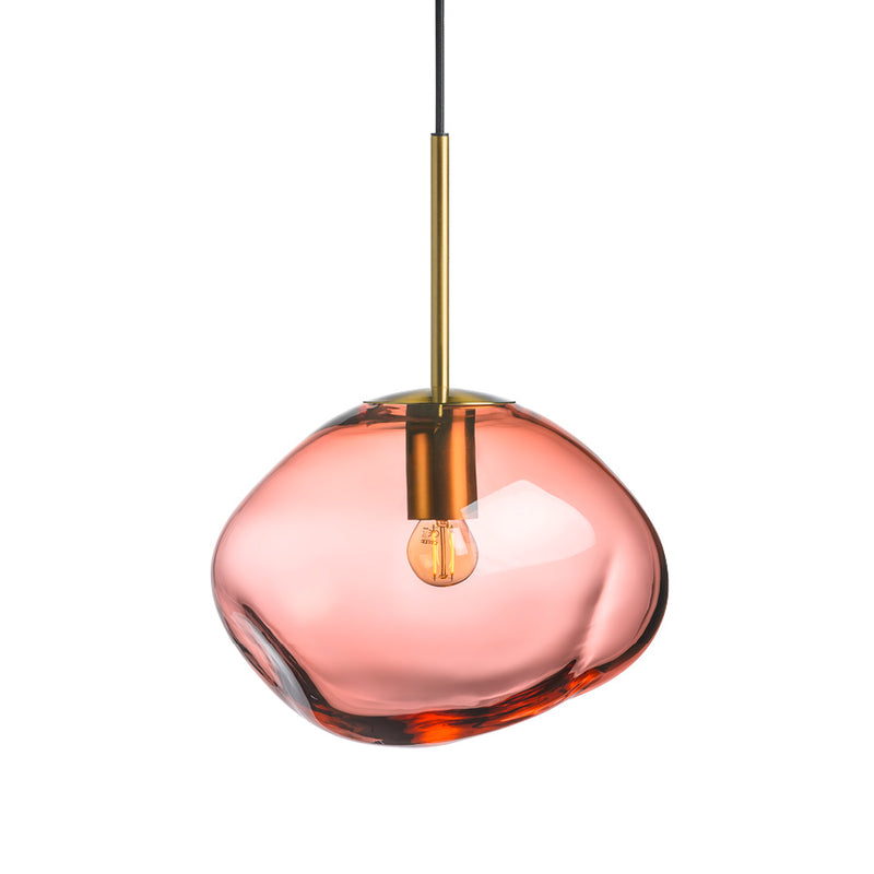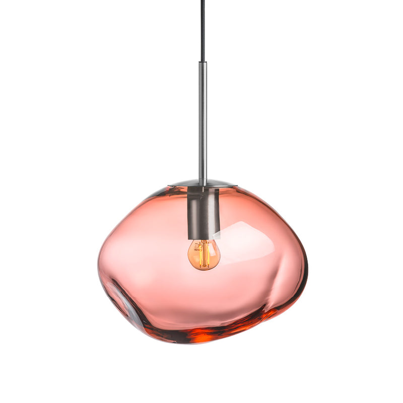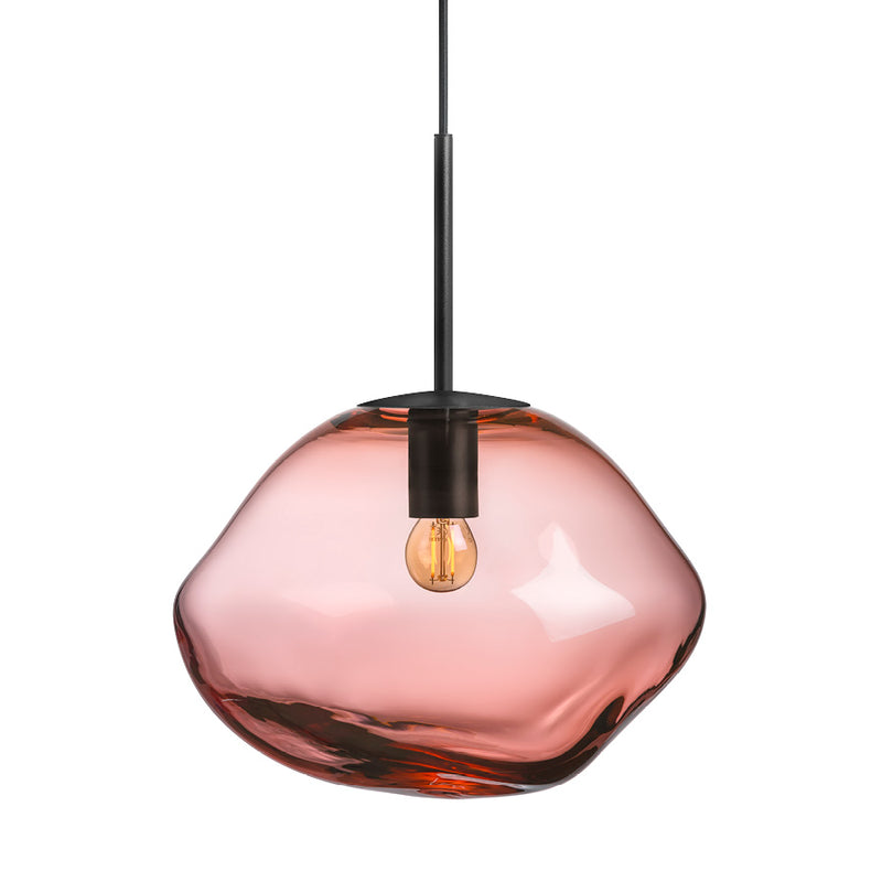 Create a warm and inviting atmosphere with the Morgenrød glass pendant lamp. Inspired by the soft hues of sunrise. All lamps are mouth-blown and the organic shape is formed while the glass is hot, making each shade unique. The Morgenrød color adds vibrancy when combined with smoke gray, cocoa, and clear.