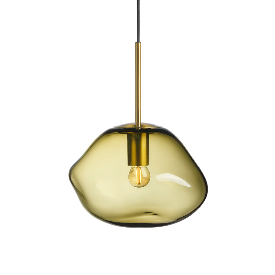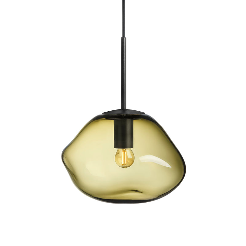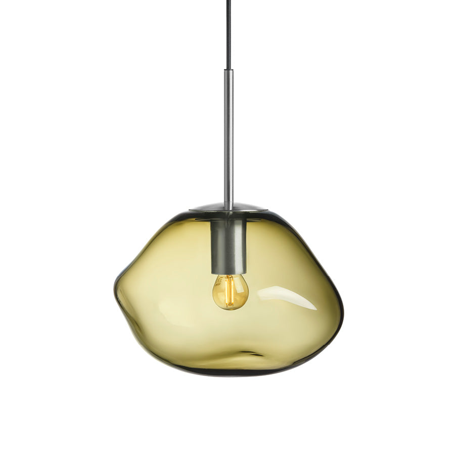 Experience a sense of calm and balance with the olive glass pendant lamp. It conjures thoughts of lush forests and moss-covered stones. Each lamp is mouth-blown and the organic shape is created while the glass is hot, making every shade unique. The olive color pairs beautifully with smoke gray, cocoa, and clear.