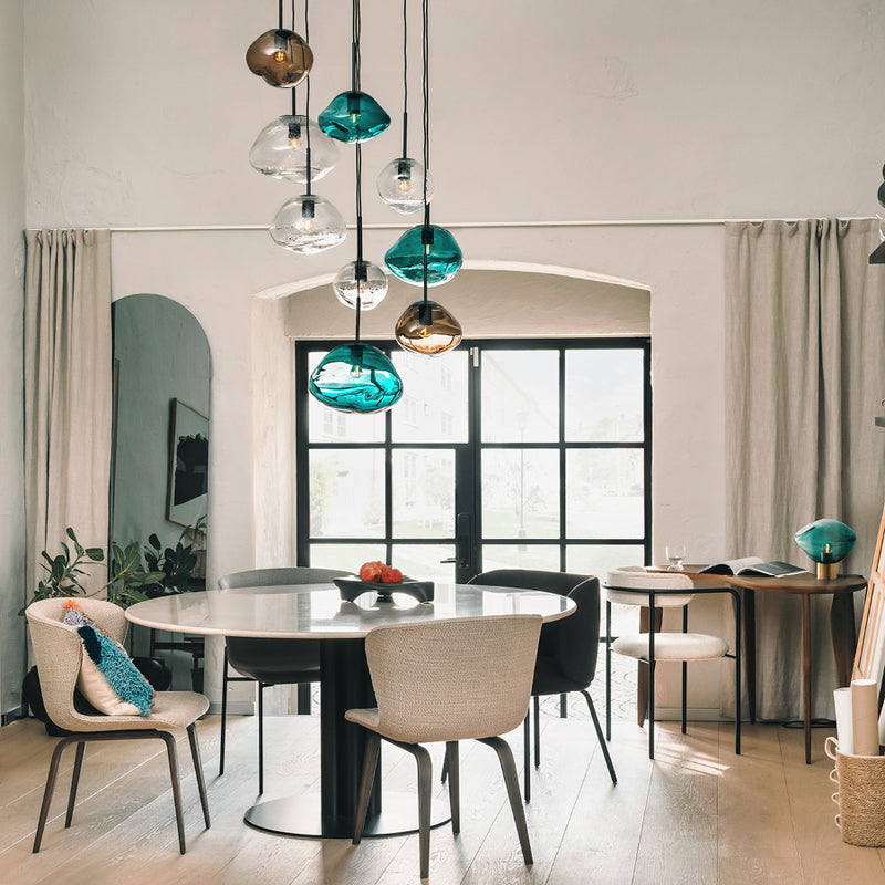 Create energy and freshness with blue-green glass pendant lamps. Associations to clear lakes and sparkling glaciers. All lamps are mouth-blown and the organic shape is created while the glass is hot, making each shade unique. The blue-green color adds vibrancy when combined with smoke gray, cocoa, and clear.