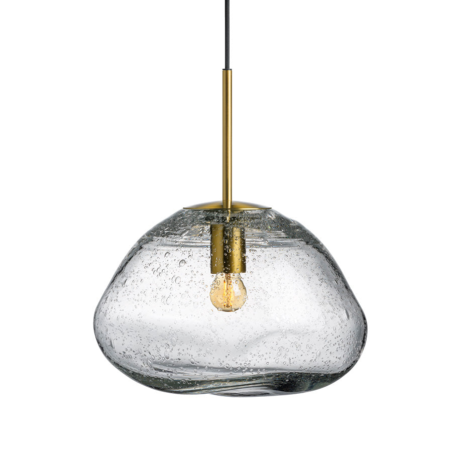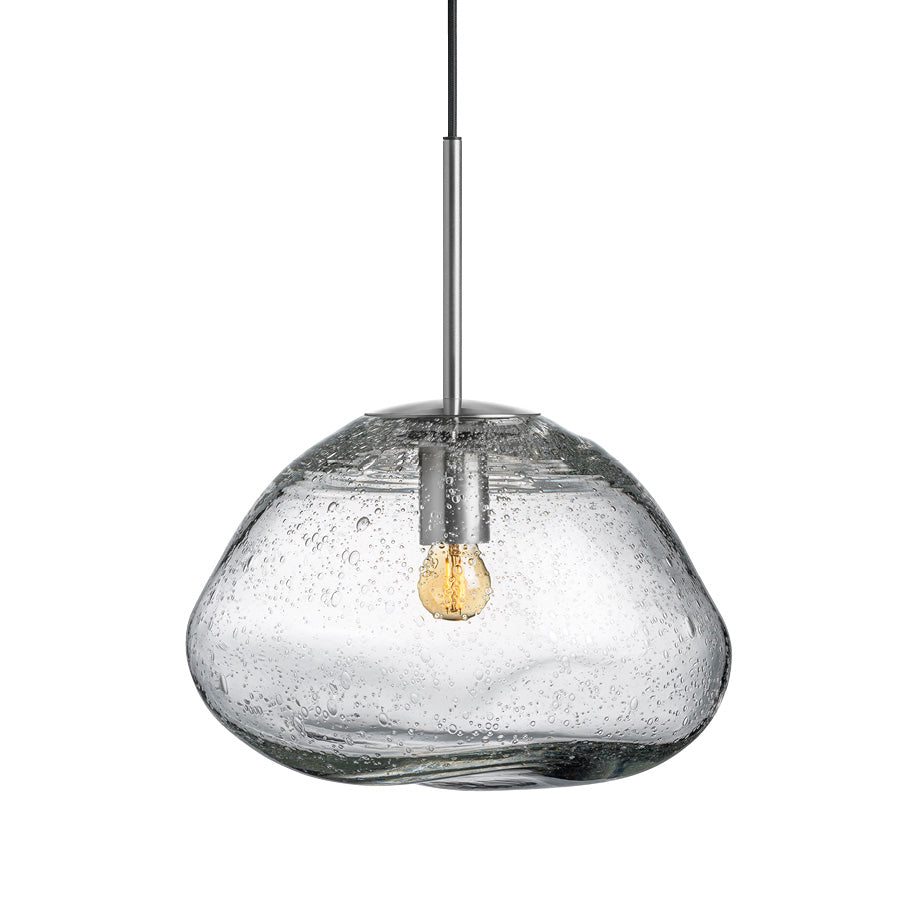 Clear soda glass pendant lamps create a stunning play of light, reminiscent of raindrops on a window or the shimmer of icicles in spring. Every lamp is mouth-blown, and the organic shape is formed while the glass is hot, making each shade truly unique. The clear color is easy to combine with any of the other colors in the series.