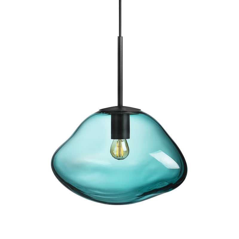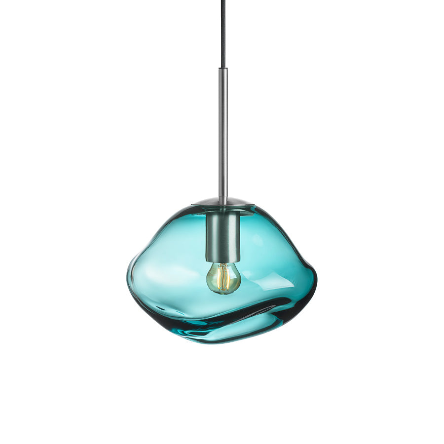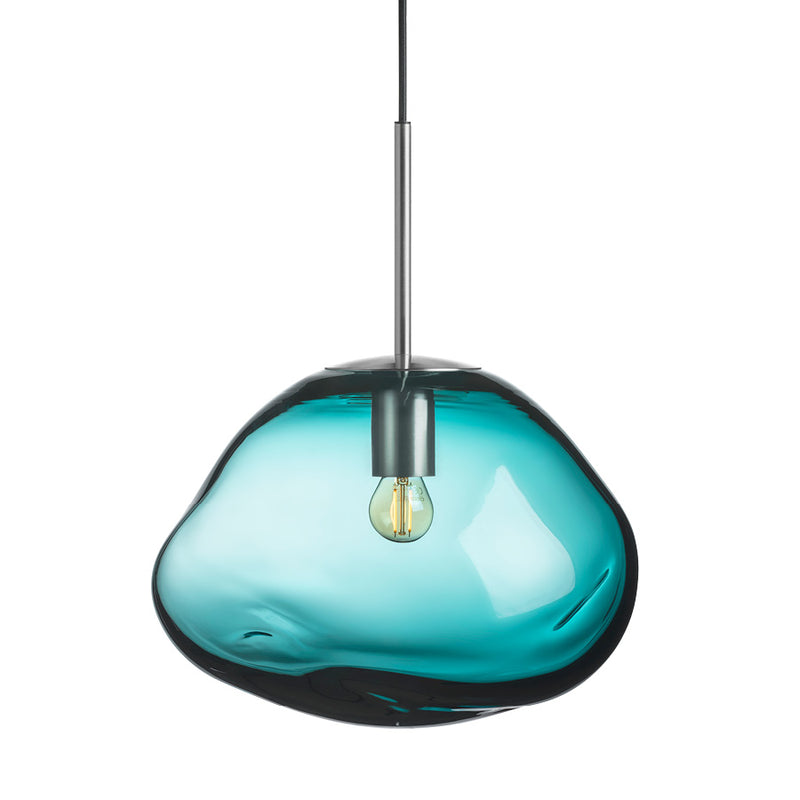 Each shade is mouth-blown and shaped while the glass is hot, resulting in natural variations that make every lamp unique. Blue-green works beautifully on its own and pairs well with smoke grey, cocoa, and clear glass.