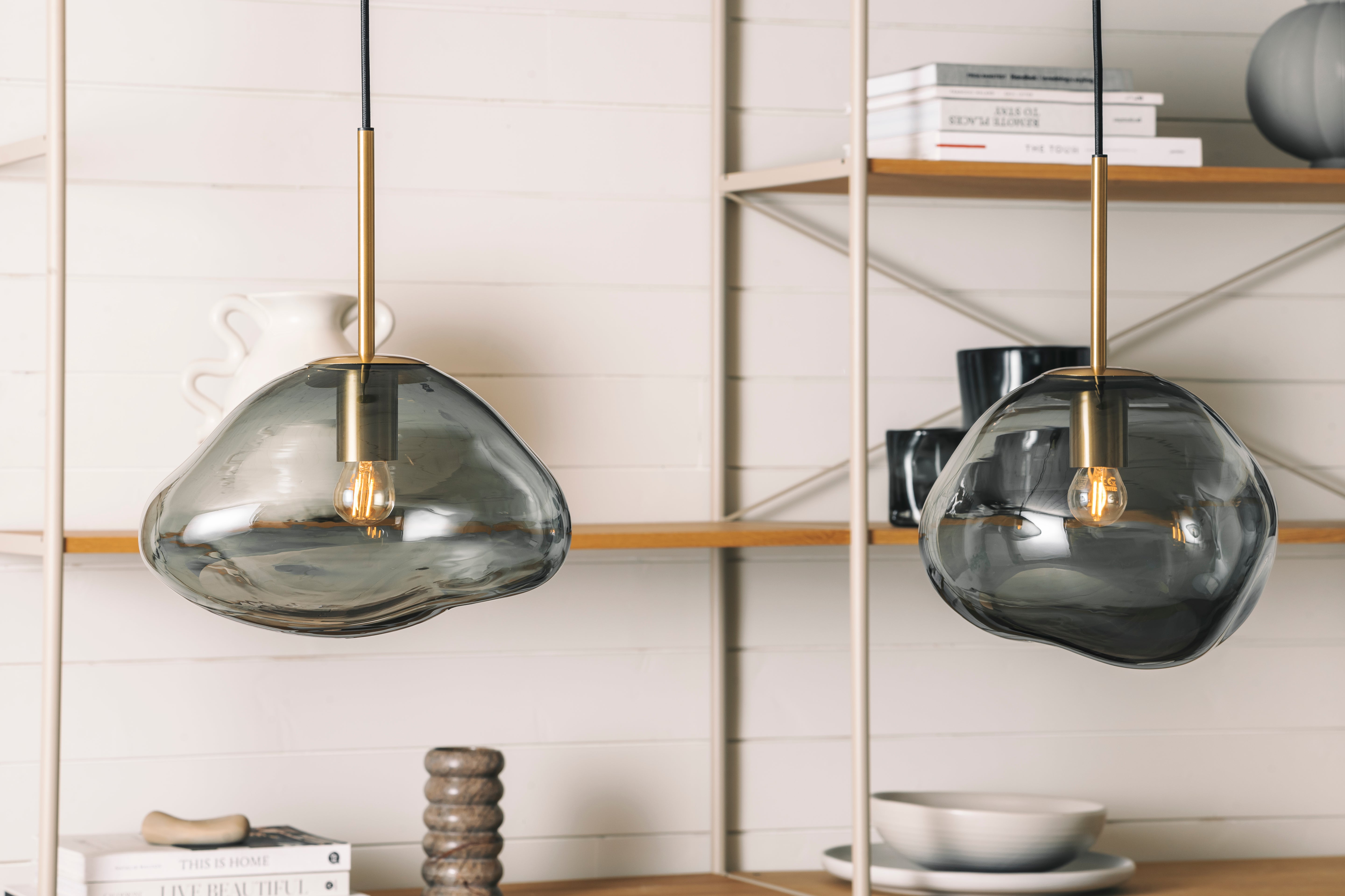 Each shade is mouth-blown, with an organic form that softens the light and gives the lamp a timeless character. Smoke grey works well in both contemporary and classic interiors.