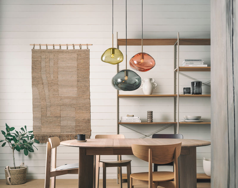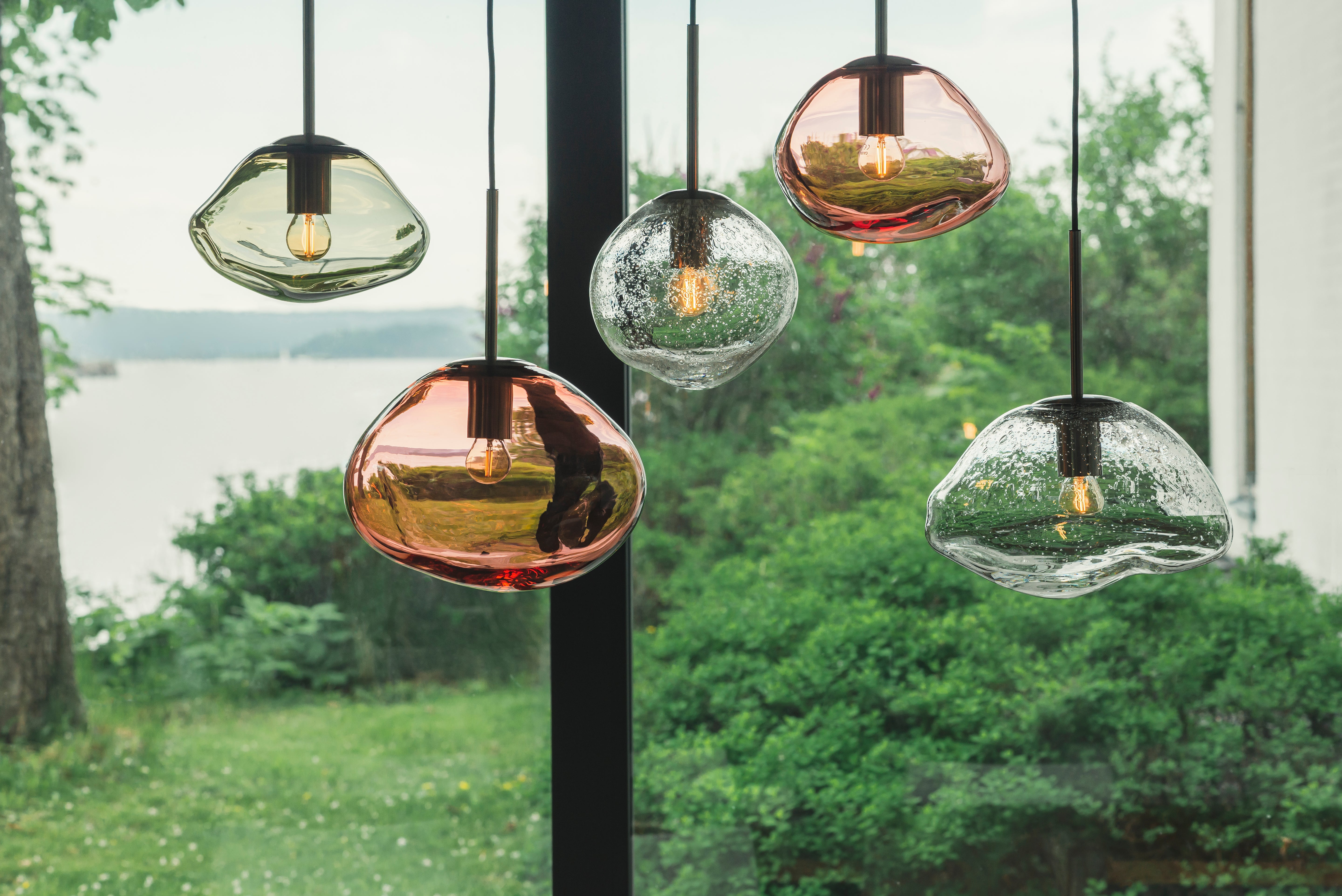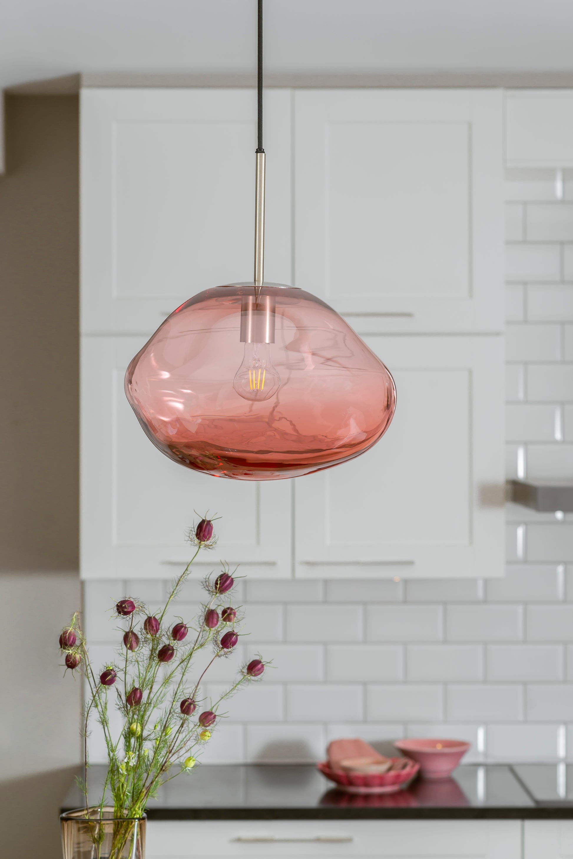 Each lamp is mouth-blown, creating subtle variations that make every shade unique. Morning red pairs beautifully with smoke grey, cocoa, and clear glass.