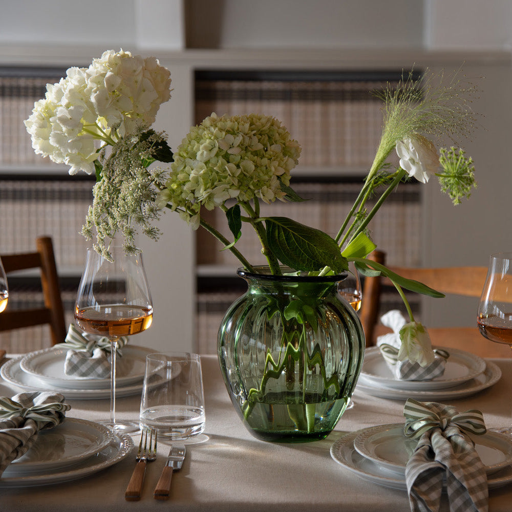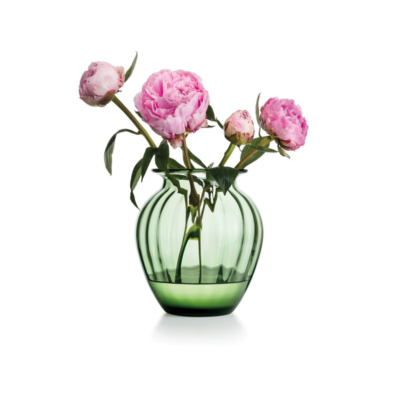 The Emily vase in green optical glass has a classic and inviting look, with organic shapes and a pattern that beautifully captures the light.
