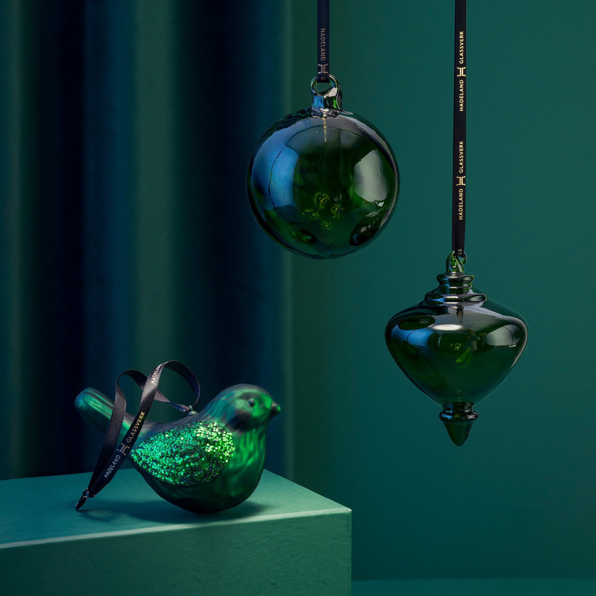 Fugleklang Green, set of 3, from Hadeland Glassverk is inspired by natural tones and traditional Christmas design. The mouth-blown green birds and baubles bring freshness and soft light reflections to your holiday décor. Beautiful on the tree, in a window, or as part of a winter display.