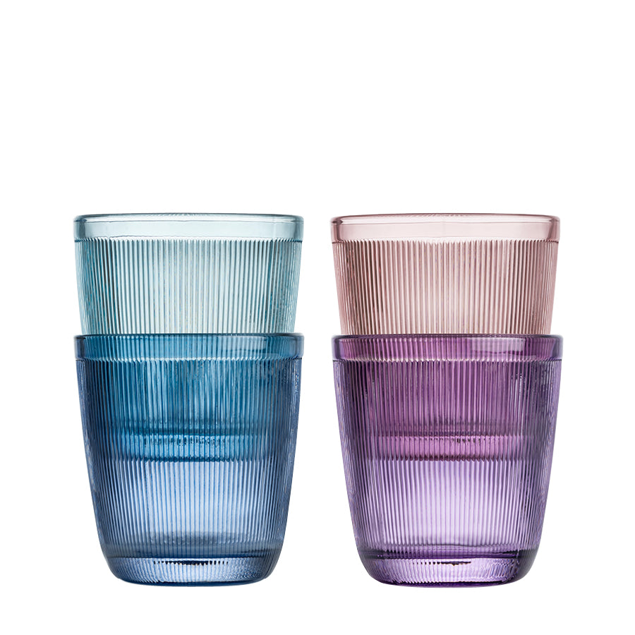 Four glasses, 20cl size, in sky blue, pink, purple, and light blue. Sleek, minimalist water glasses with a decorative ribbed pattern, perfect for both everyday use and special occasions. The glasses are easy to stack, saving space in your kitchen cabinet.