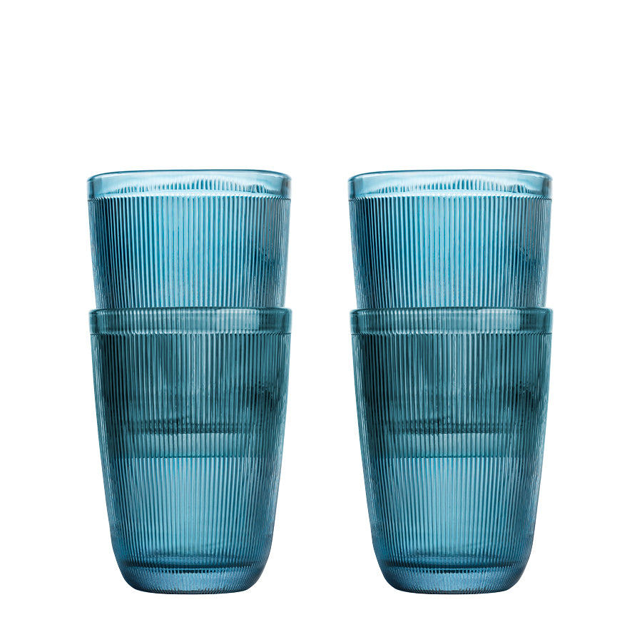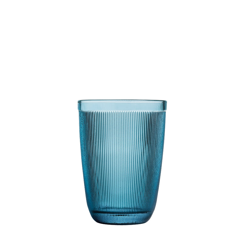 Slim, stylish blue water glasses with a decorative ribbed pattern, perfect for both everyday use and special occasions. The glasses are easy to stack, saving space in your kitchen cabinet. Available in two sizes, 20 cl and 30 cl.
