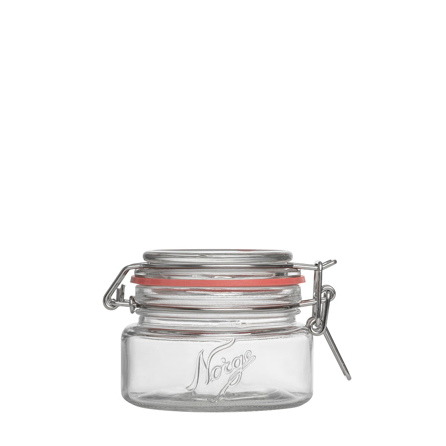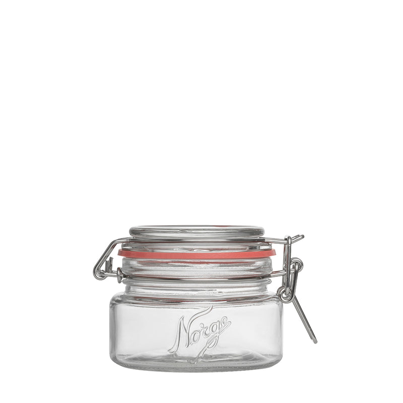 The bail lidded Norgesglass jar is perfect for pickling, preserving, home canning and storing food. It is solid, practical and lovely for decoration purposes. Holds 0,2l. The Norgesglass with the characteristic Norge (Norway)- logo was first launched in 1902. It was a molded glass jar for airtight storage. The introduction of this product allowed Norwegian housewives to preserve food and drink for longer periods of time, and the Norge glass jar was to be found in practically every single household in the country. Over the years, the original design has remained the same. Today, with an ever-increasing focus on organic and homemade food, making use of fruits, berries and mushrooms fresh from the forest or the garden, the old, lidded jar has not only proved that it is here to stay. Norge is today a brand with a variety of products, from drinking glasses, new types of glass jars, jugs, cups and bottles in all shapes and sizes.