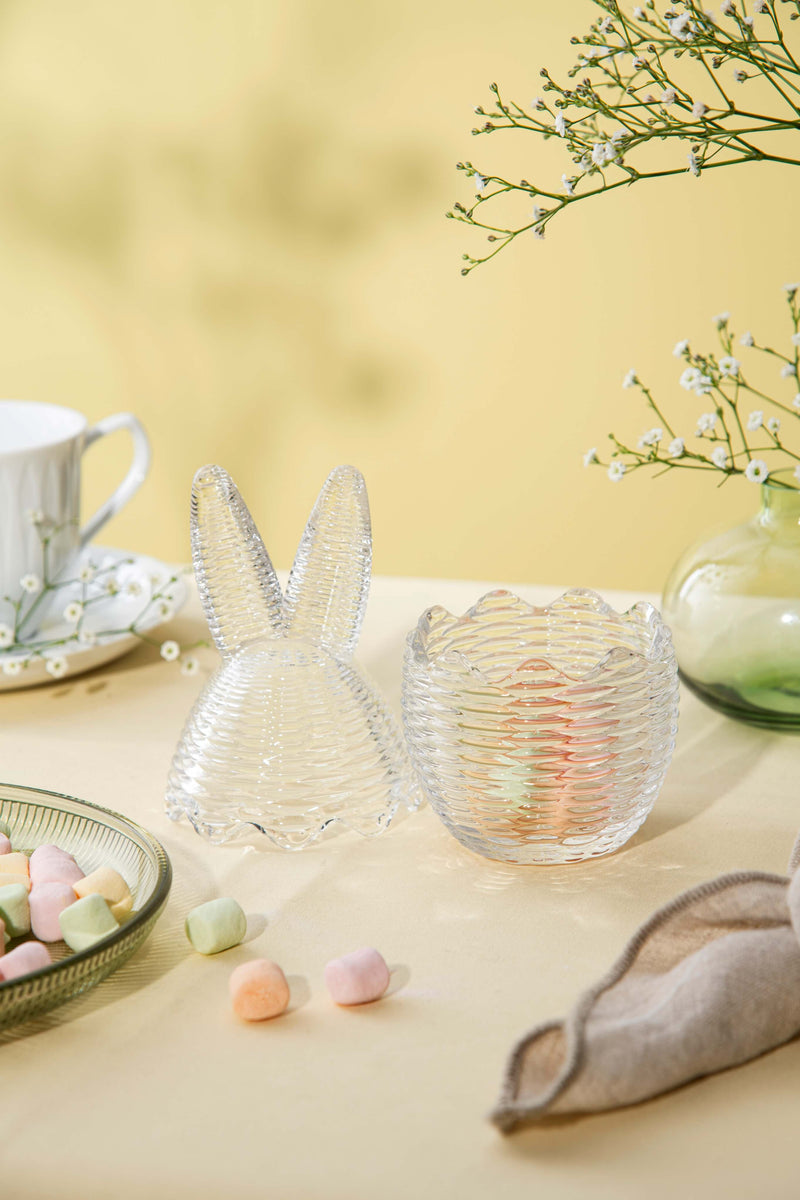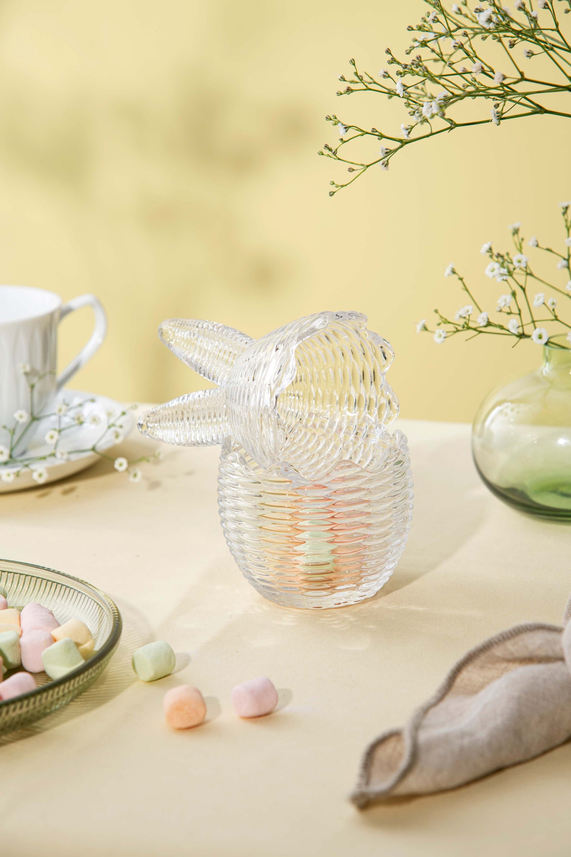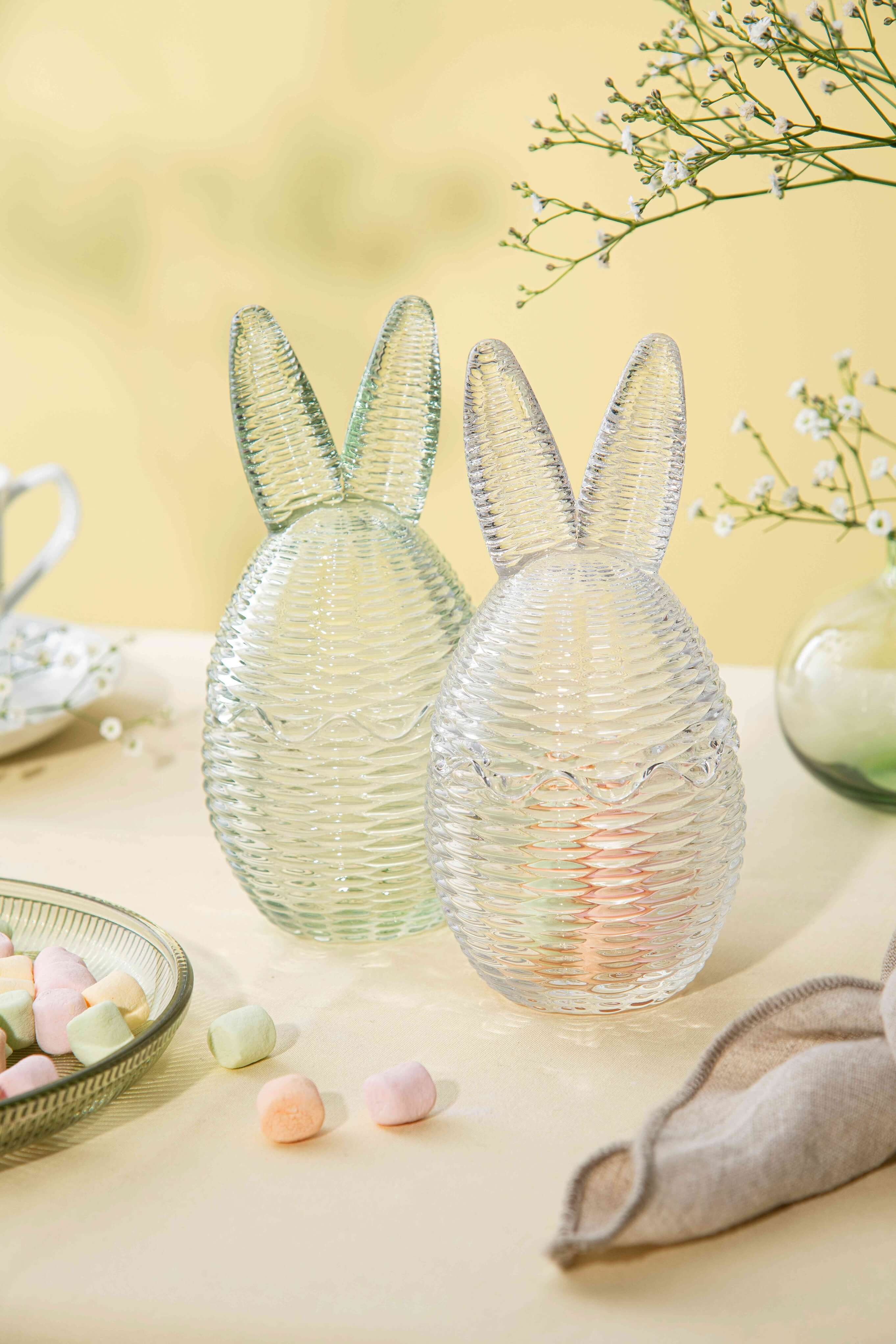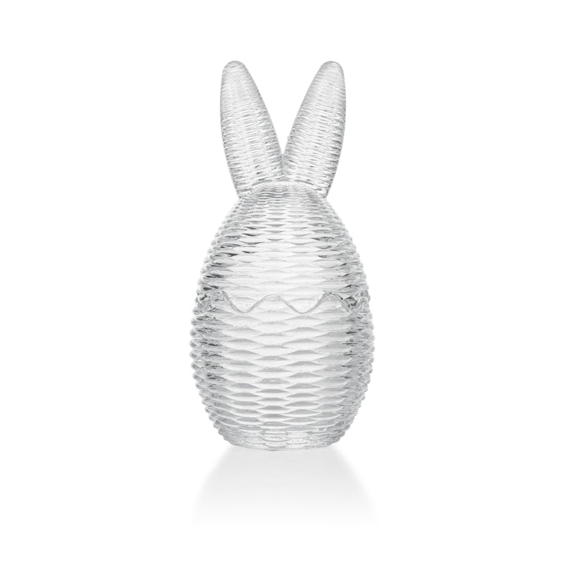 A playful and decorative glass egg with lid, topped with charming bunny ears. The bold basket-inspired optic pattern adds texture and character, making it a distinctive Easter centrepiece.