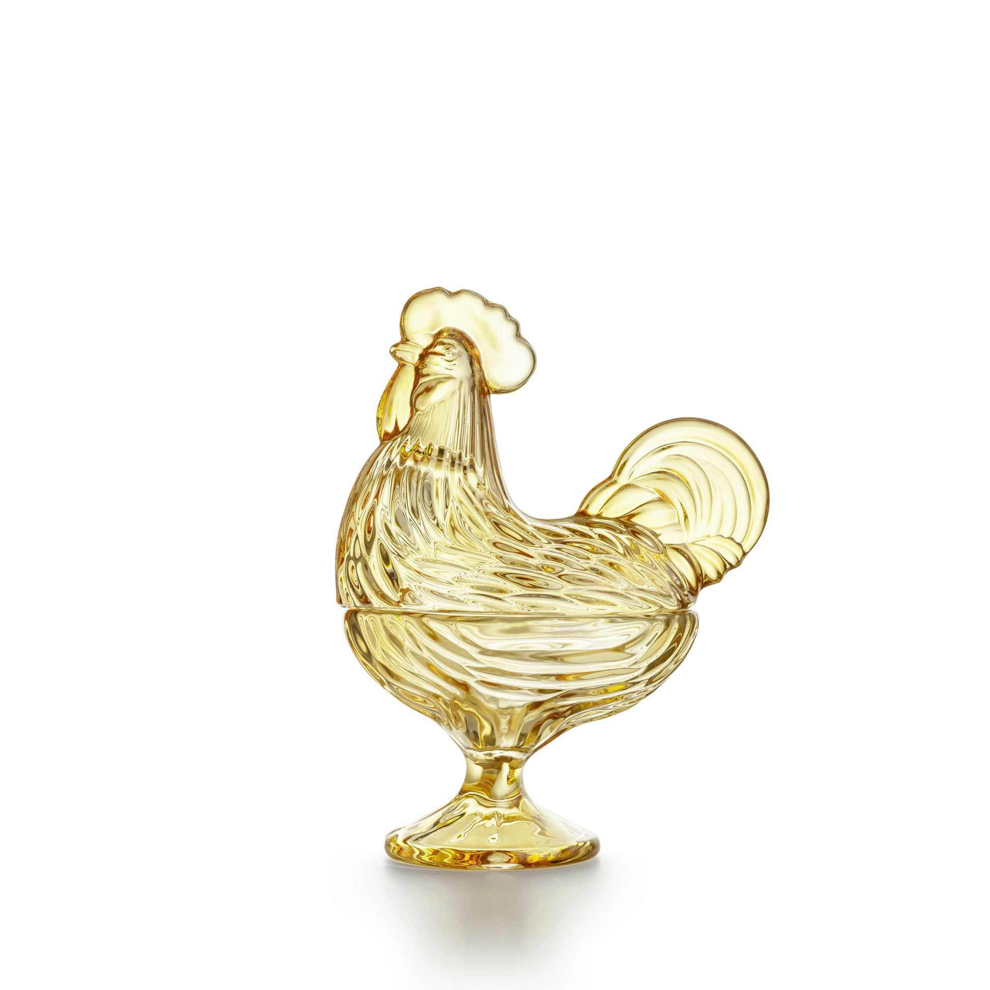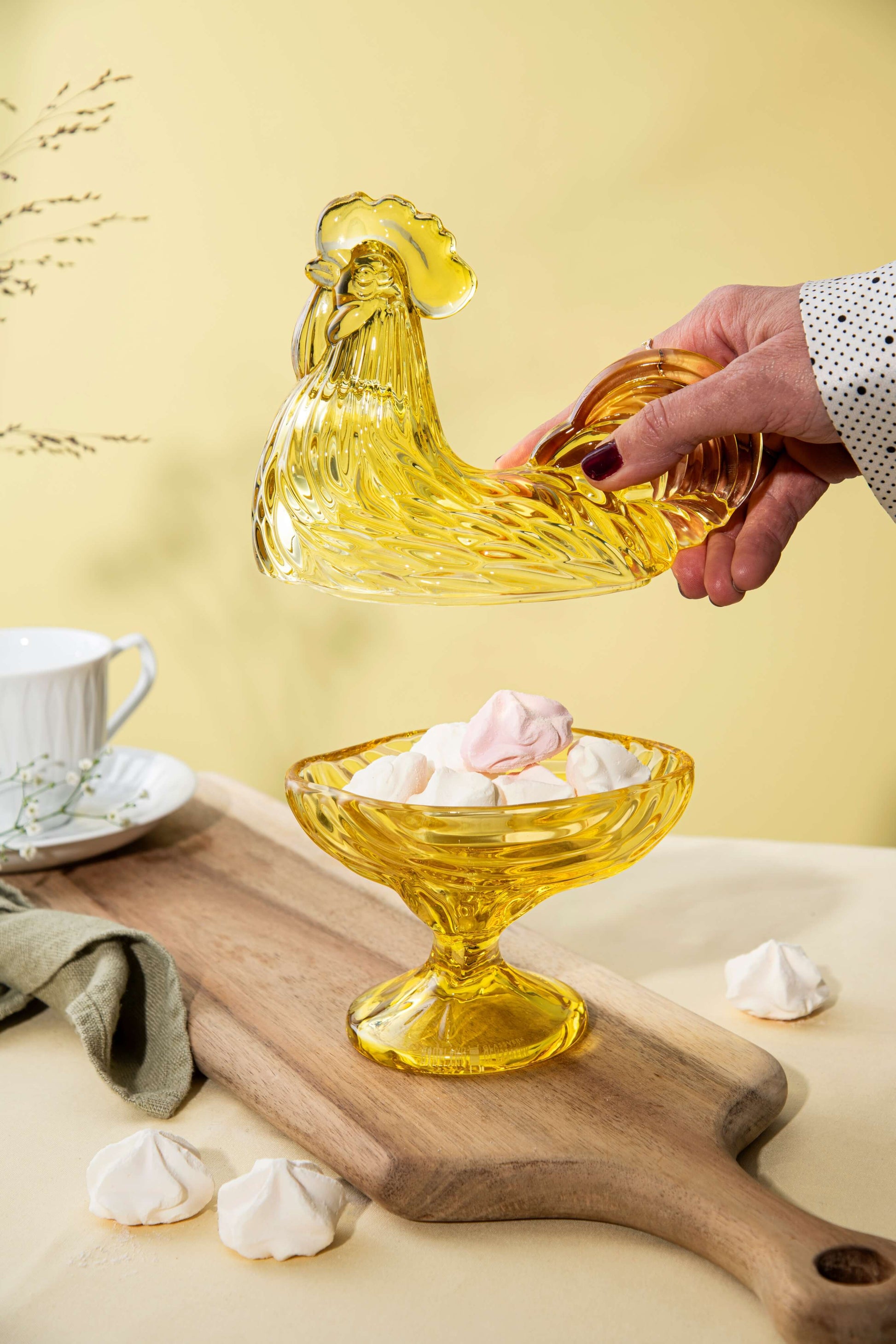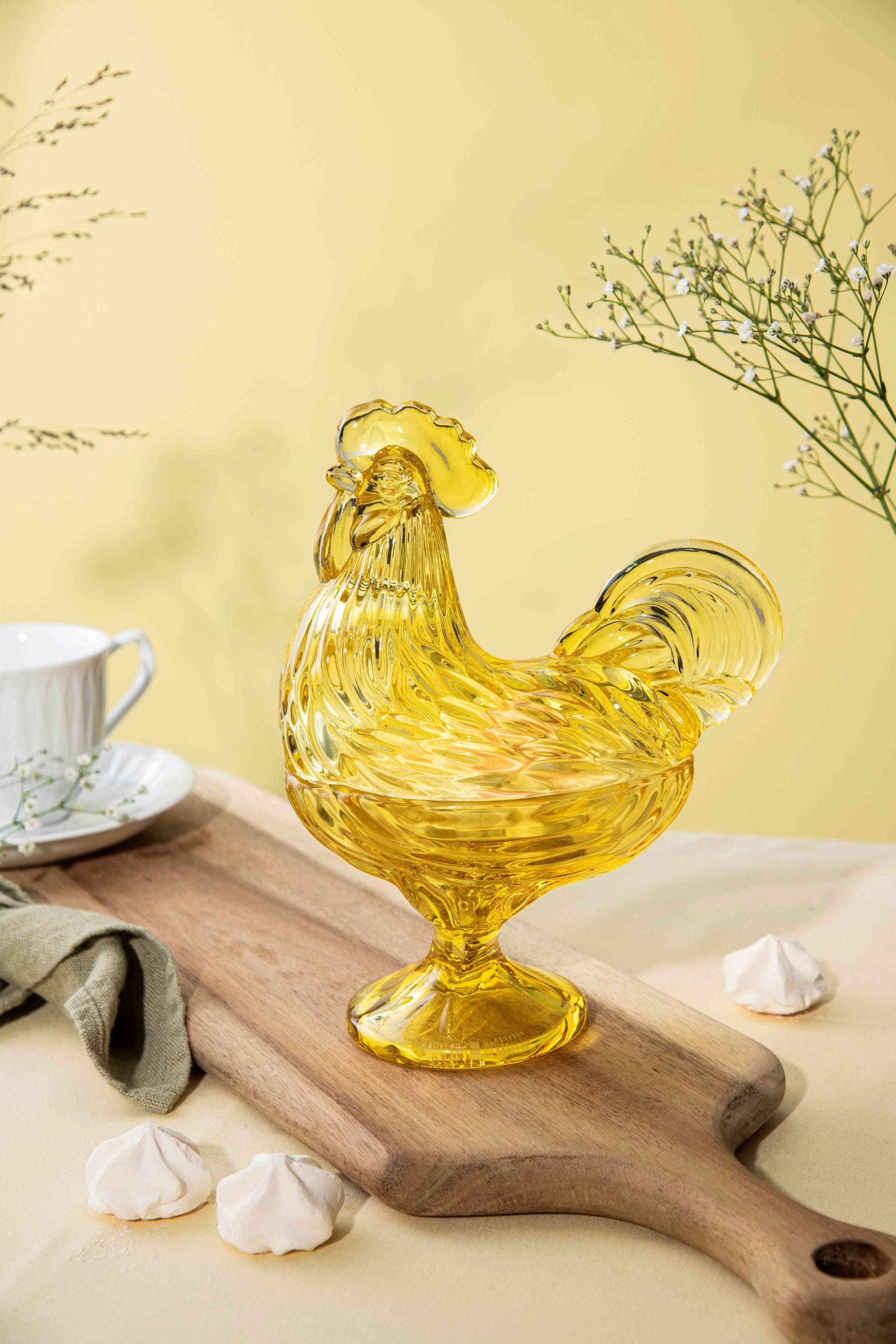 En mindre variant av den klassiske glasshanen med lokk. Den kompakte størrelsen gjør den perfekt til mindre serveringer eller dekorative plasseringer, samtidig som den bevarer sitt karakteristiske uttrykk.