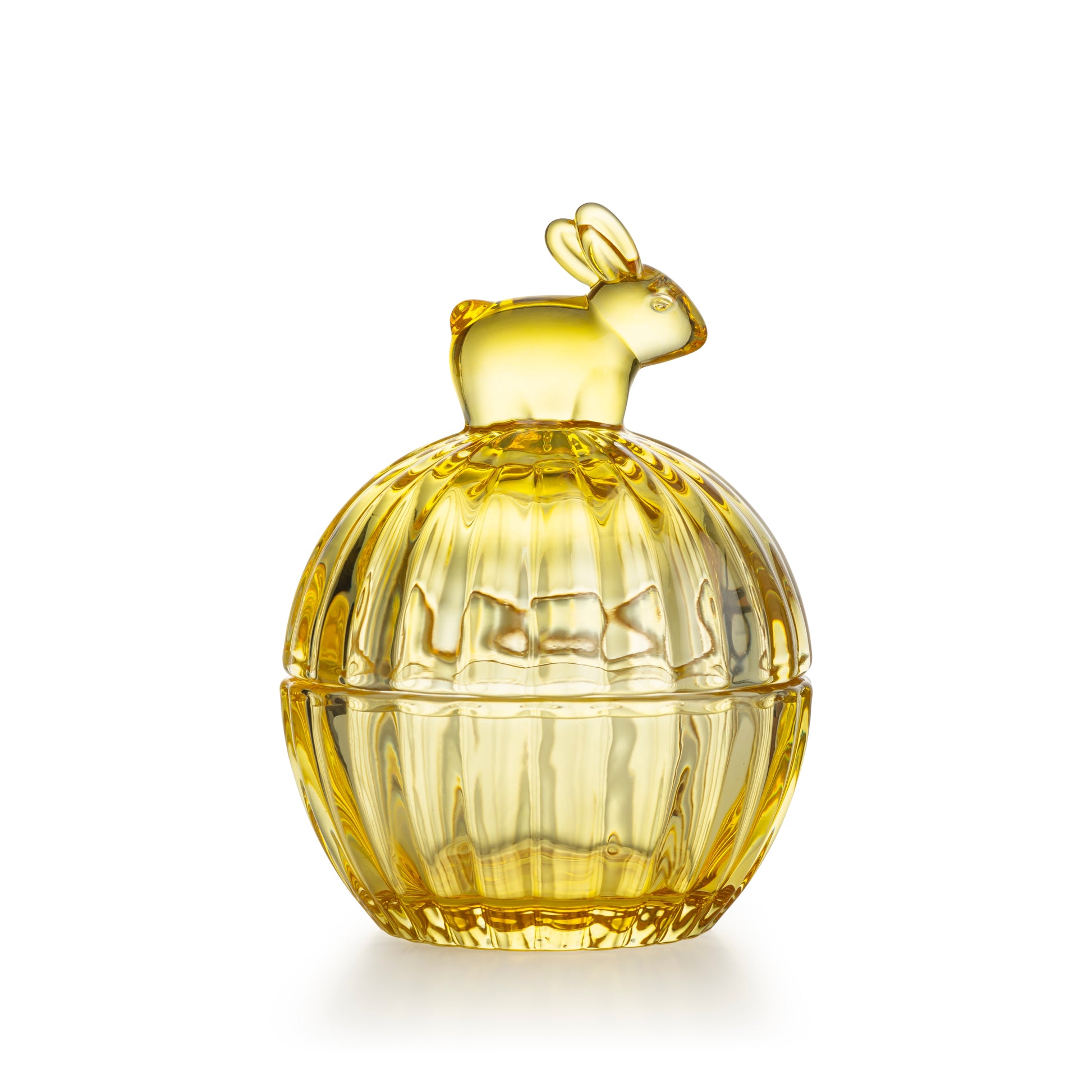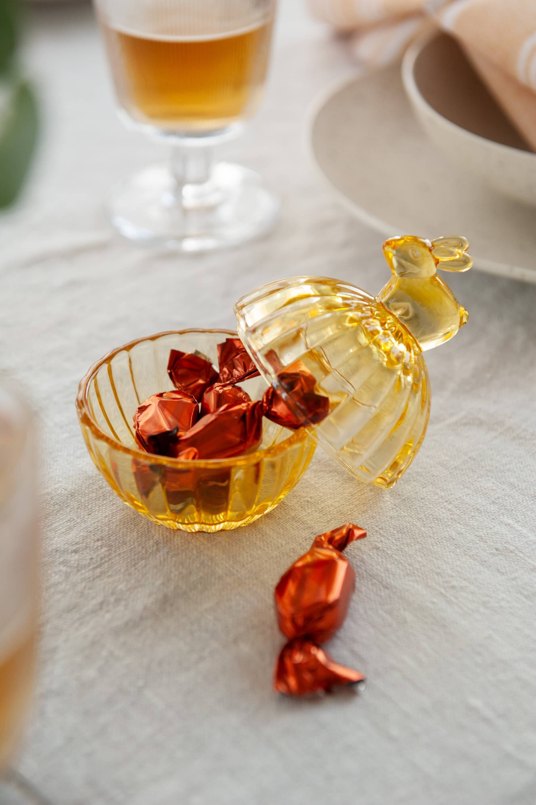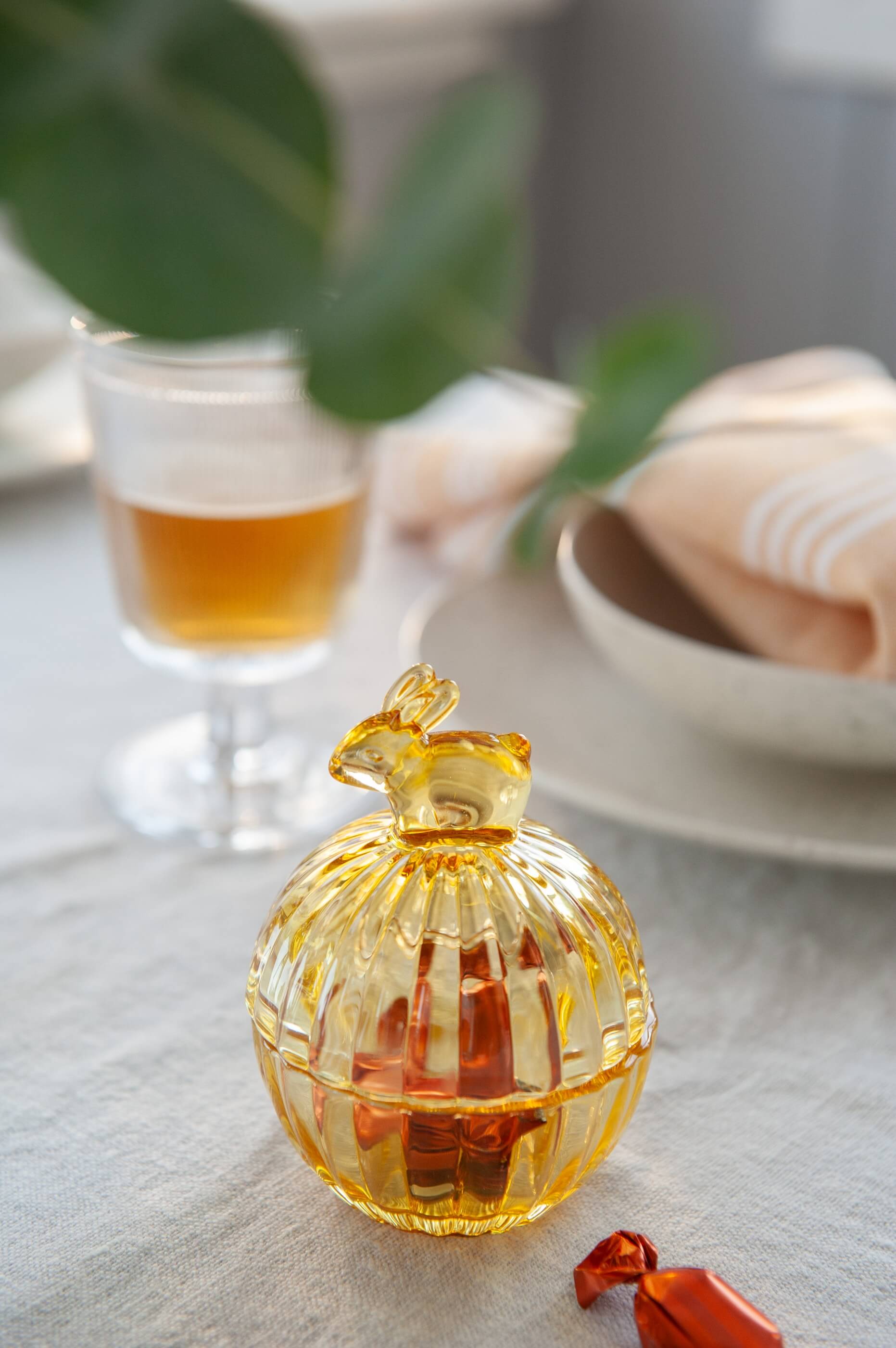 A charming glass bowl with lid, featuring a hare detail. The clear yellow glass adds brightness and warmth to Easter décor.