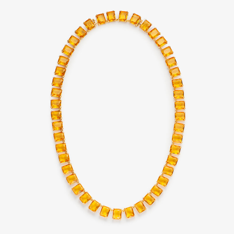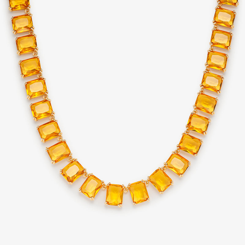 The Glør necklace is inspired by Nordic glow and light. The large rectangular yellow glass stones shine with a powerful, modern and luxurious expression. Completed with 18K gold-plated details, this necklace is crafted to stand out and truly shine — no matter the occasion.