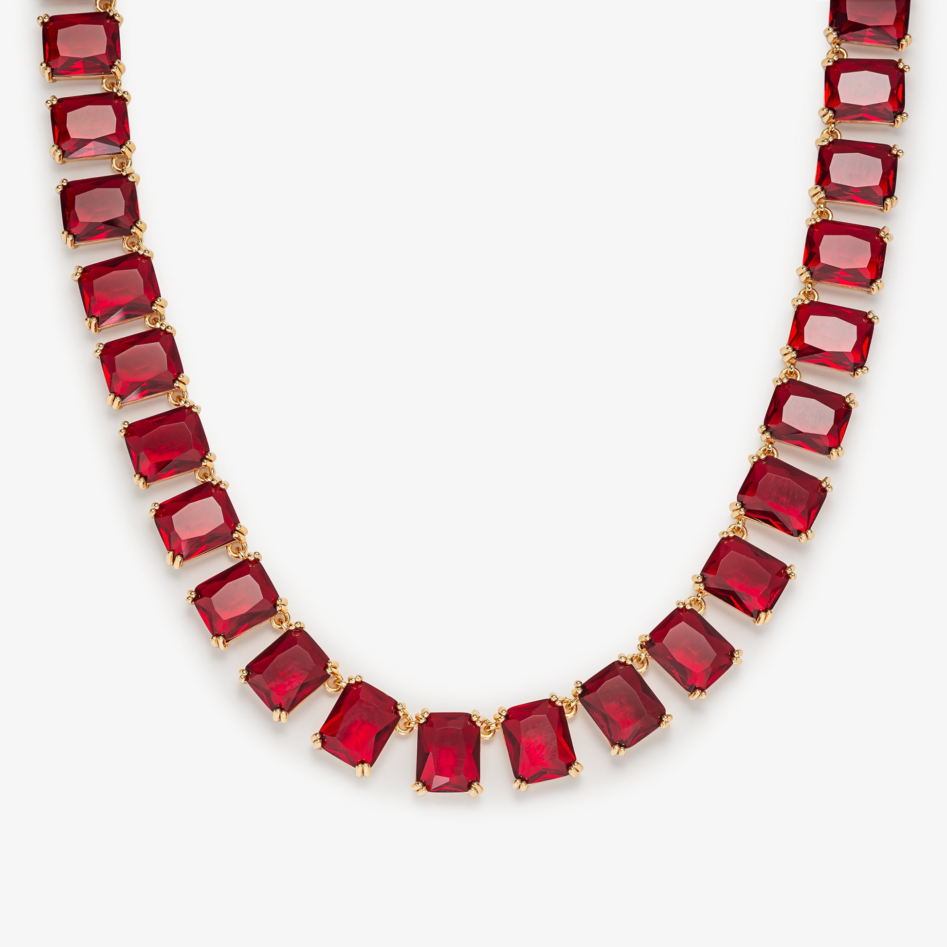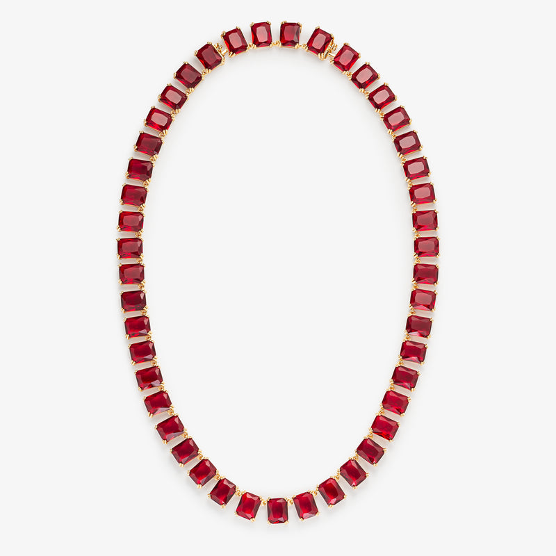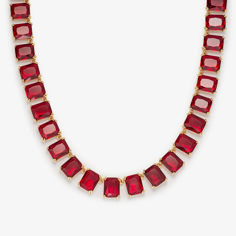 The Glør necklace is inspired by Nordic glow and light. The large rectangular red glass stones shine with a powerful, modern and luxurious expression. Completed with 18K gold-plated details, this piece is crafted to stand out and truly shine — no matter the occasion.