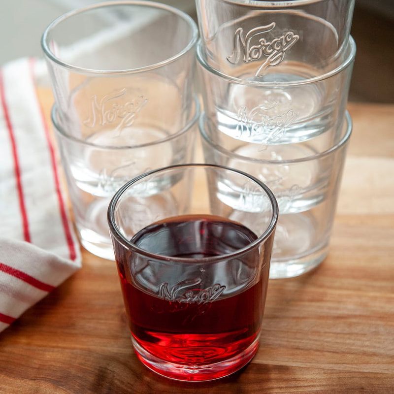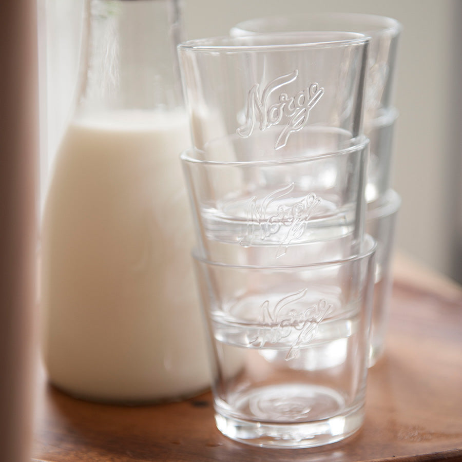 Beautiful drinking glasses with the classic Norges logo. The glasses are thick and sturdy, suitable for both hot and cold drinks. The drinking glasses are sold in packs of 6 and are stackable.