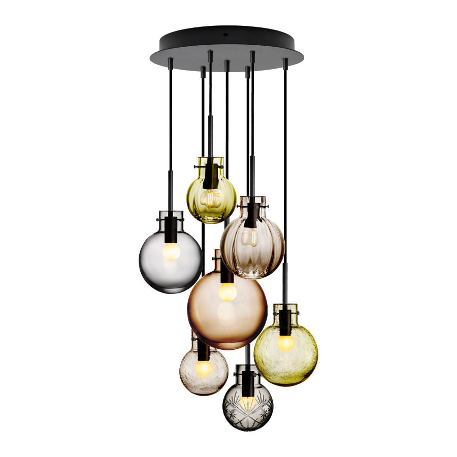- Black suspension for 7 crystal globes with black, fabric-covered cable, 3 meters long