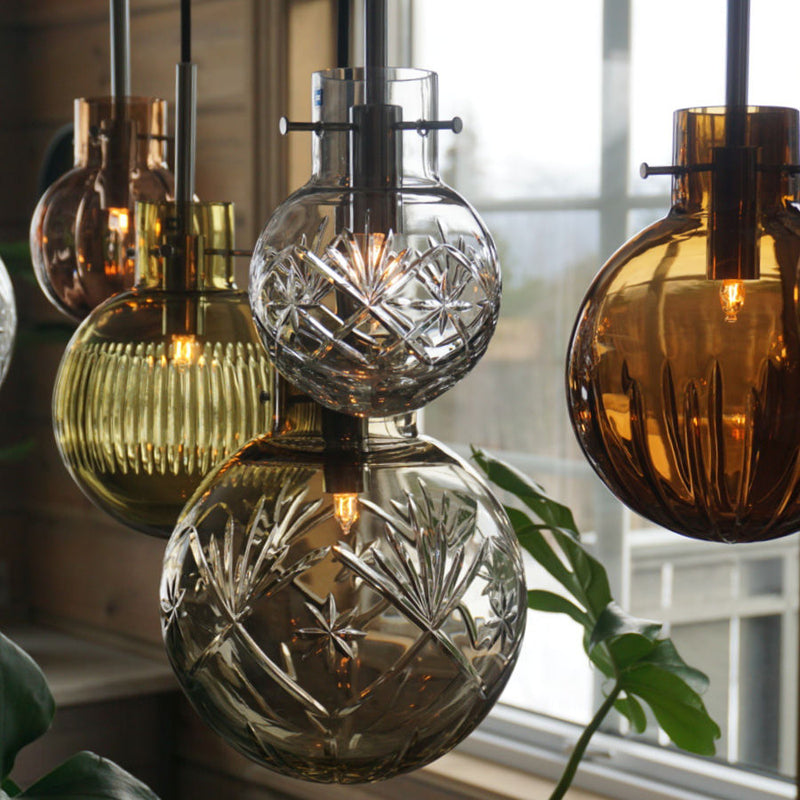 Interior stylist Renate Larsen Lorentzen has chosen the perfect combination of crystal spheres for her own cabin. She opted for the classic cut patterns Finn, Skjær, and Optikk in the colors clear, cocoa, and olive. Now you too can achieve Renate’s gorgeous style with her custom-designed crystal sphere lamp Rav.