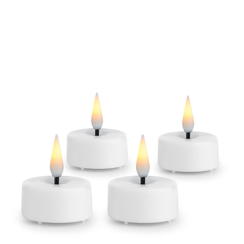 LED tealights, 4-pack, with a lifelike, flickering flame provide the cozy ambiance of real candles—without any risk of fire, soot, or smoke. The candles have a wax-coated surface for an authentic look and fit most tealight holders, lanterns, and decorations.