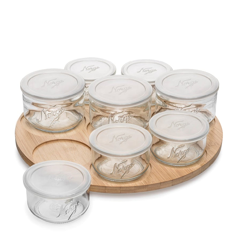 A complete set with 8 bowls in 2 sizes (3 pcs 730ml, 5 pcs 370ml), with plastic lids and a rotating wooden tray. Perfect for tacos, tapas, meze, and other small dishes. With the airtight lids, the bowls can be closed and placed in the fridge for easy and practical storage.