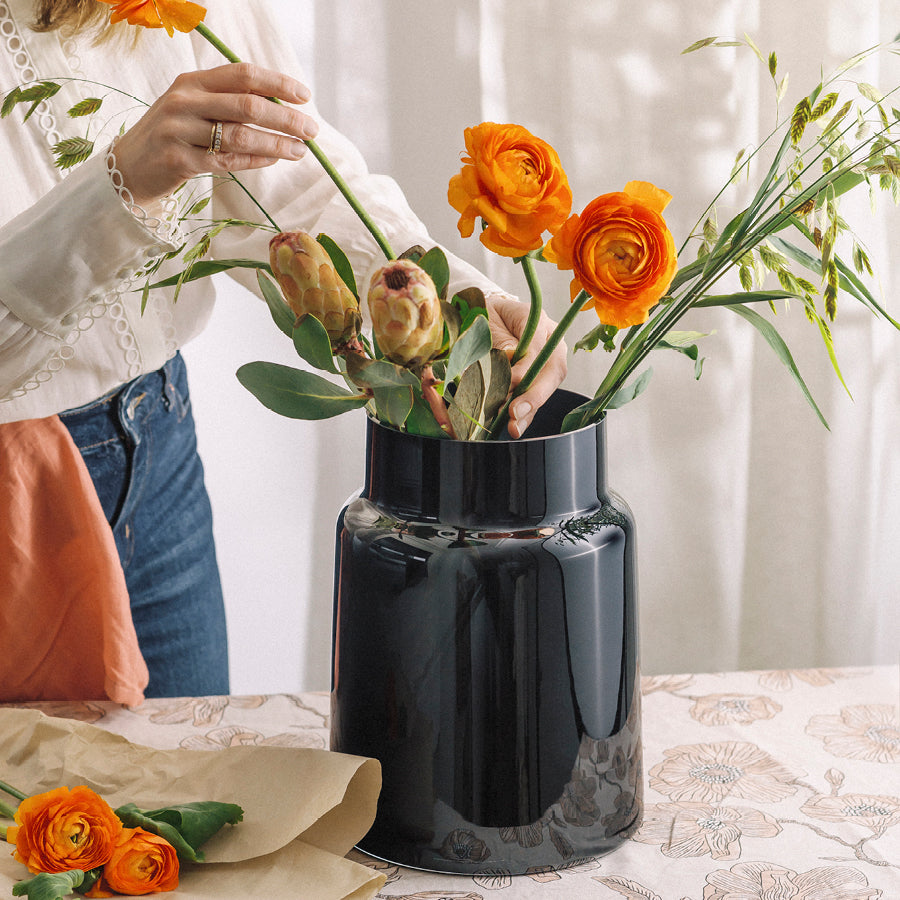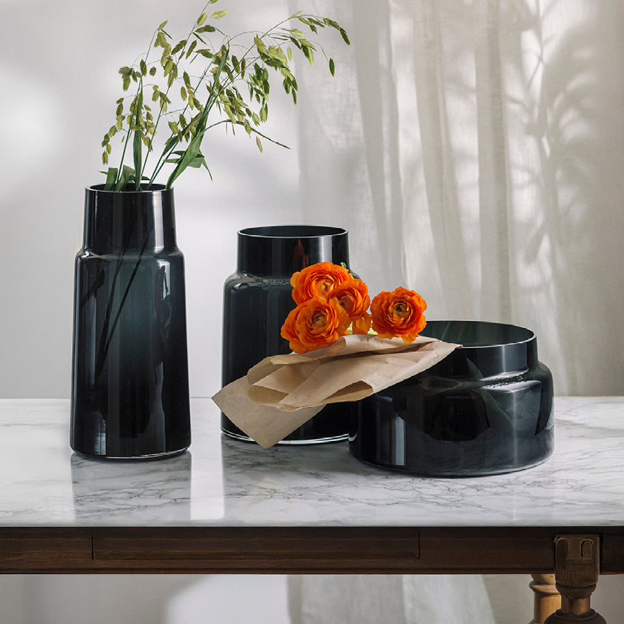 The Tindre series is inspired by modern Nordic style with clean lines. A harmonious expression that fits perfectly in any home. Each product has multiple uses such as a vase, candle holder, bowl, or storage. All products are handmade/mouth-blown in colored glass. This makes each product unique.