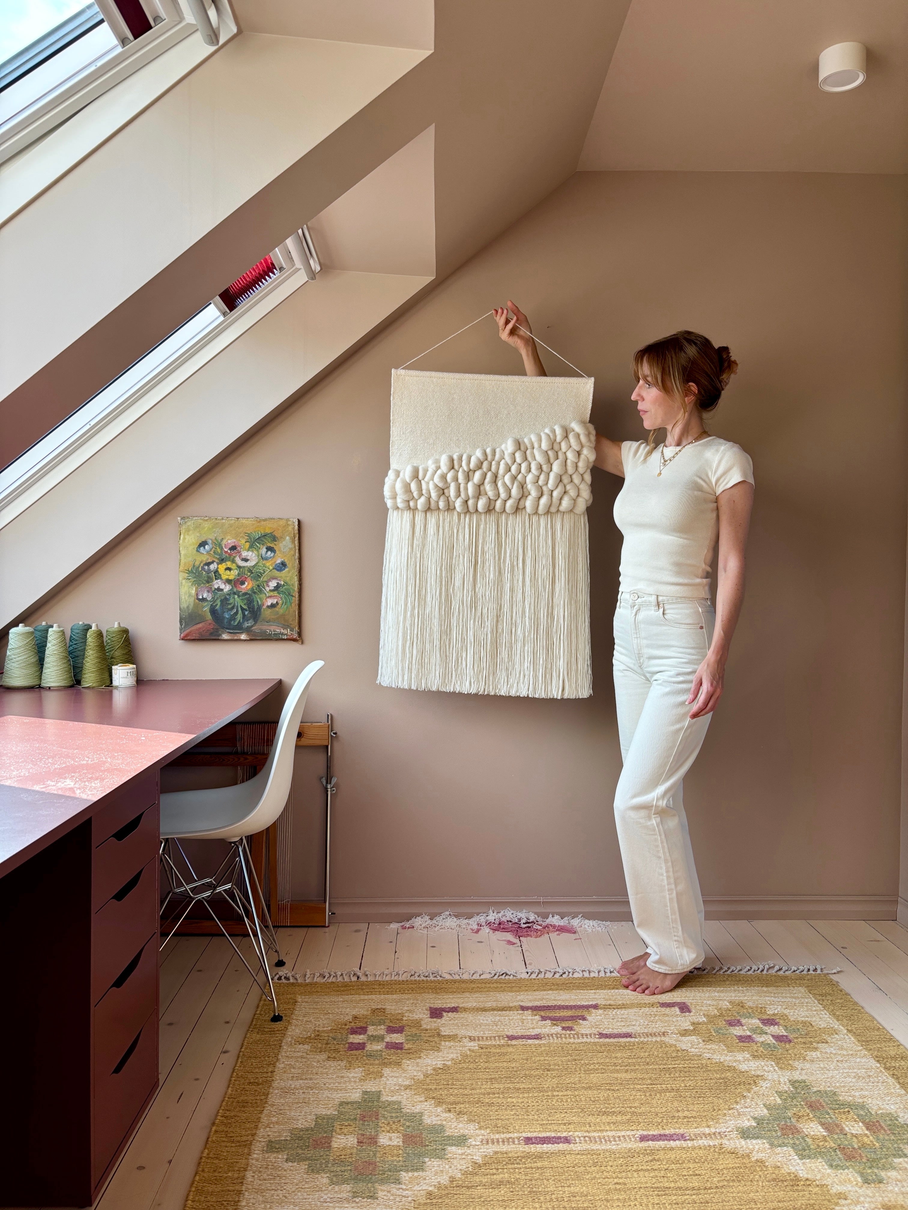 Anne Djupvik Andersen ''Weave Me Away'' vever veggtepper inspirert av tradisjonelle åkler, der gamle teknikker og materialer møter et moderne uttrykk. Arbeidene preges av harmoni, ro og nøye sammensatte farger og materialer.