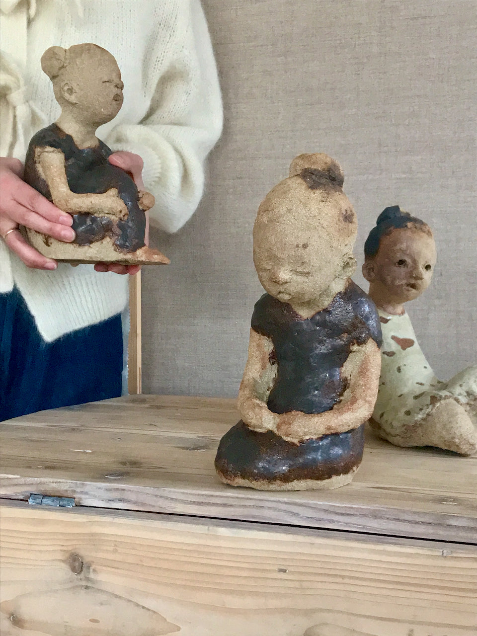 Anne-Linn Nyfelt er interiørarkitekt og kunstner som arbeider med stille liv formet i leire. Hun skaper små fortellinger og øyeblikk, ofte med jenter, kaniner eller fugler, fanget midt i en bevegelse. Arbeidene kjennetegnes av kontrasten mellom grov leire og glatt, satinerte glasurer.