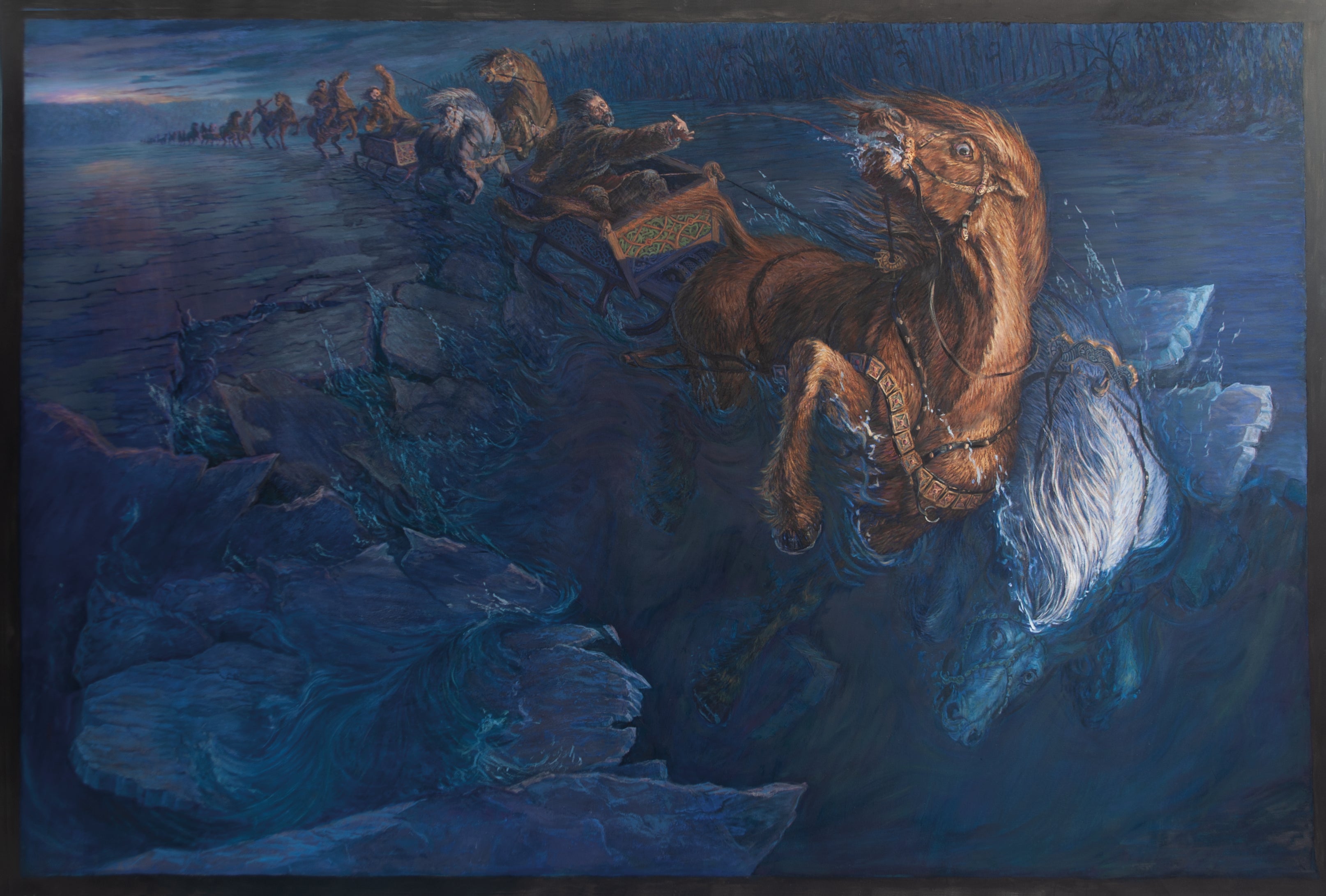 Gjennom 8 monumentale oljemalerier følger du kongen fra gjestebud, gjennom vinternatten over Randsfjordisen, ned i døden i det kalde vannet og videre til gravferdender kroppen hans ble delt og begravet fire ulike steder