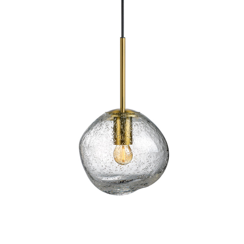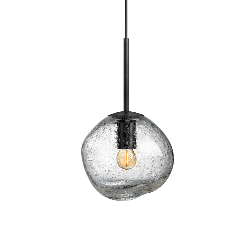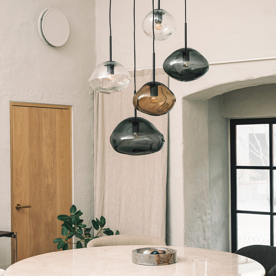 Klare soda glasspendellampe gir fantastisk lysspill Som klare regndråper på et vindu, og spillet i istapper om våren. Alle lampene er munnblåst og den organiske formen skapes når glassmassen er varm, dette gjør at hver eneste kuppel blir unik. Fargen klar er lett å kombinere med alle de andre fargene i serien.