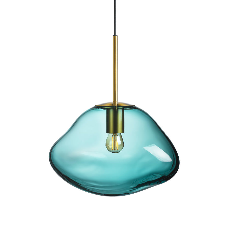 Skap energi og friskhet med blågrønne glasspendellampe. Assosiasjoner til klare sjøer og glitrende isbreer. Alle lampene er munnblåst og den organiske formen skapes når glassmassen er varm, dette gjør at hver eneste kuppel blir unik. Fargen blågrønn gir et løft i kombinasjoner med røkgrå, kakao og klar.