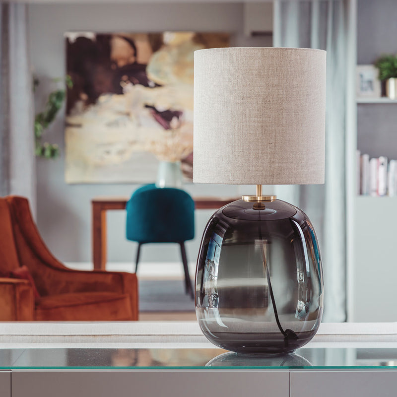 Bordlampen Austra har en organisk base i munnblåst glass og tekstilskjerm i høy kvalitet. Austra er tilgjengelig i ulike glass- og skjermfarger, slik at du kan sette sammen den perfekte lampen til ditt hjem.