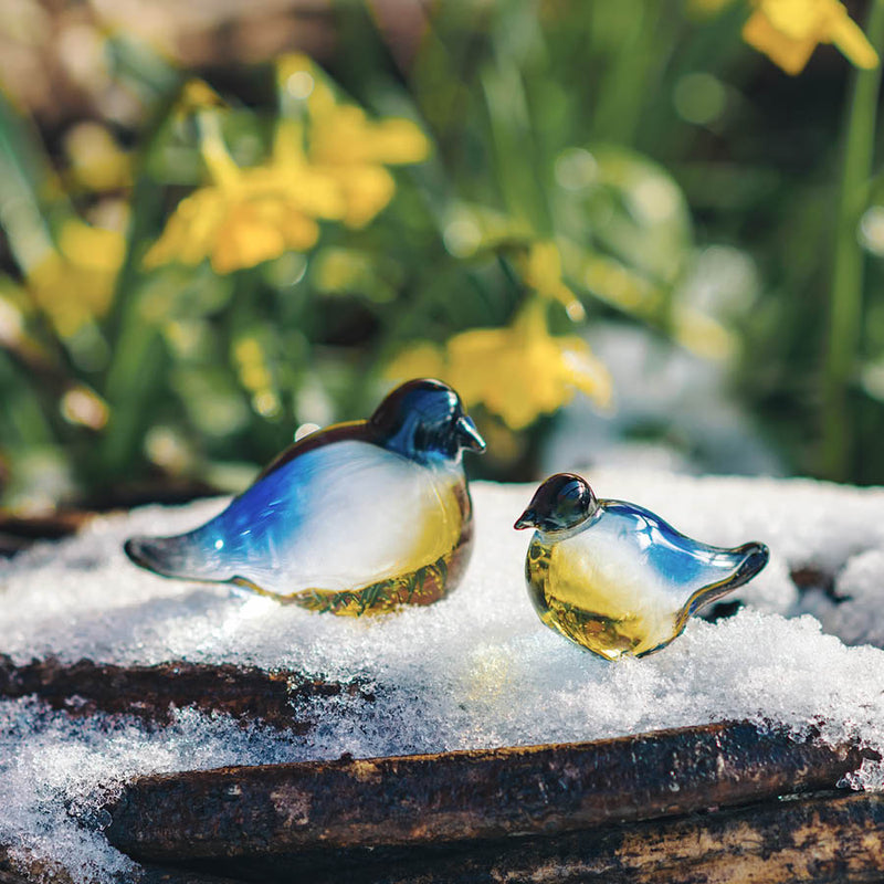 Blåmeis glassfigur 6 cm 2 pk fra Hadeland Glassverk består av to små, håndlagde fugler i munnblåst glass. De harmoniske fargetonene i blått og gult reflekterer lyset vakkert og gir et friskt preg til interiøret.