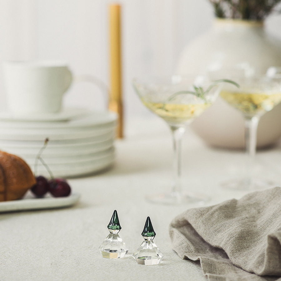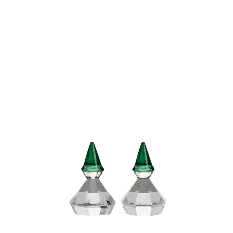 Nisser fra Hadeland Glassverk i glass, formet som en diamant med nisselue. Den julegrønne luen bidrar til en tradisjonsrik julestemning og de to små nissene kan brukes i utallige kombinasjoner med annen julepynt. Det klassiske uttrykket passer inn i enhver interiørstil. Nissene er 4,35 cm høye og kommer i en pakke på 2 stk.