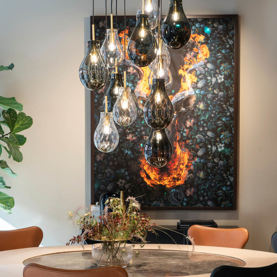 Med inspirasjon fra vannet og vannets bevegelser, ble denne unike kombinasjonen av mønster og form til. Dråpens to ulike mønster skaper et nydelig lys mot veggen. Lampen er like nydelig alene som i klynge. Dråpe munnblåses og håndslipes på Hadeland Glassverk etter 250 år gamle teknikker. Designet av Lina Rincon