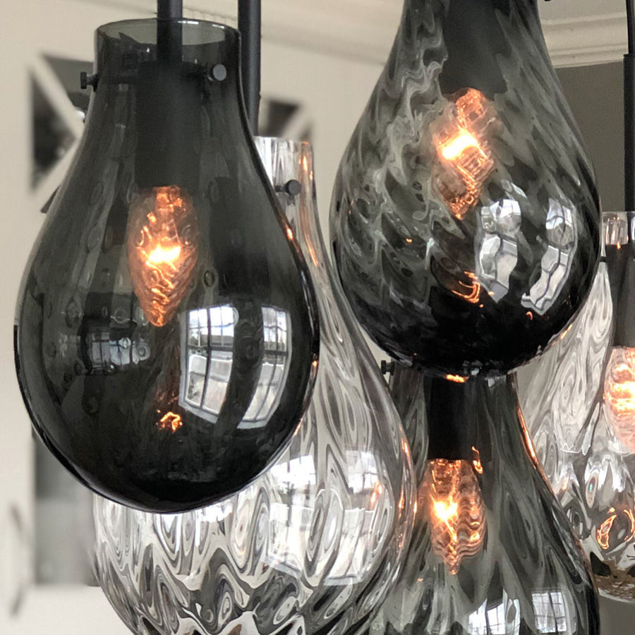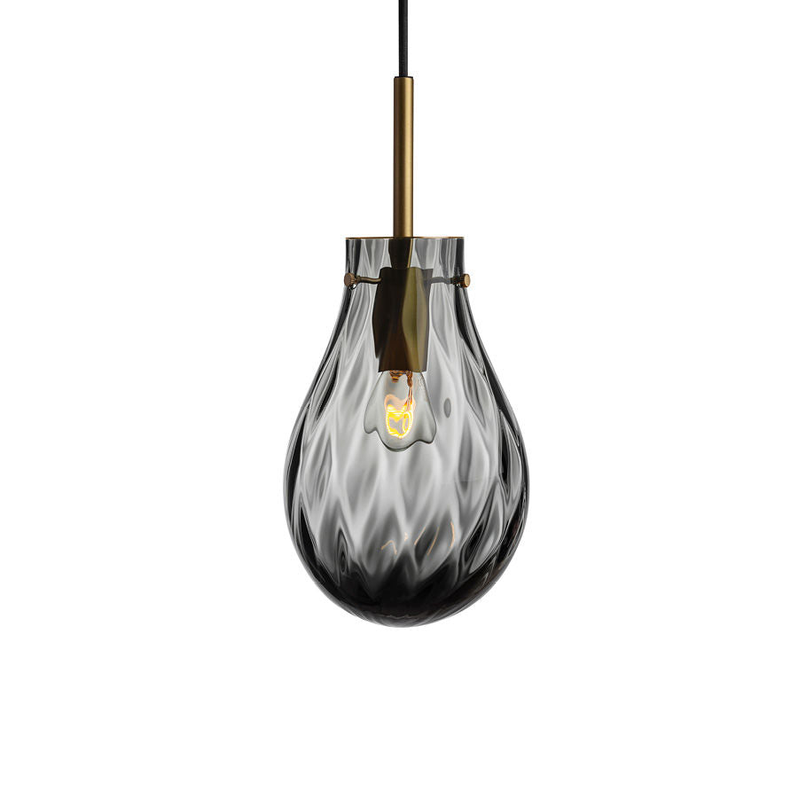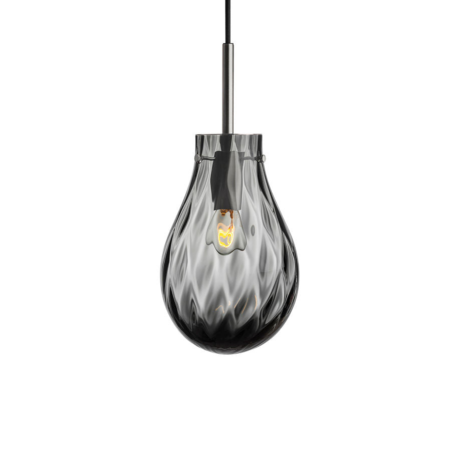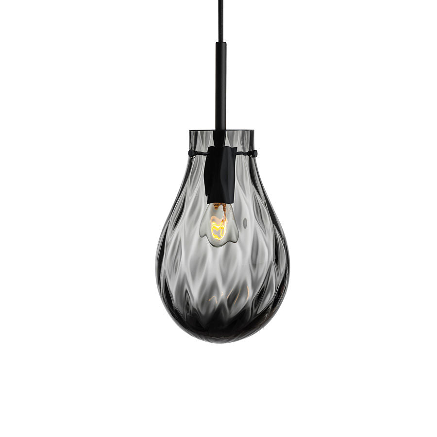 Med inspirasjon fra vannet og vannets bevegelser, ble denne unike kombinasjonen av mønster og form til. Dråpens to ulike mønster skaper et nydelig lys mot veggen. Lampen er like nydelig alene som i klynge. Dråpe munnblåses og håndslipes på Hadeland Glassverk etter 250 år gamle teknikker. Designet av Lina Rincon