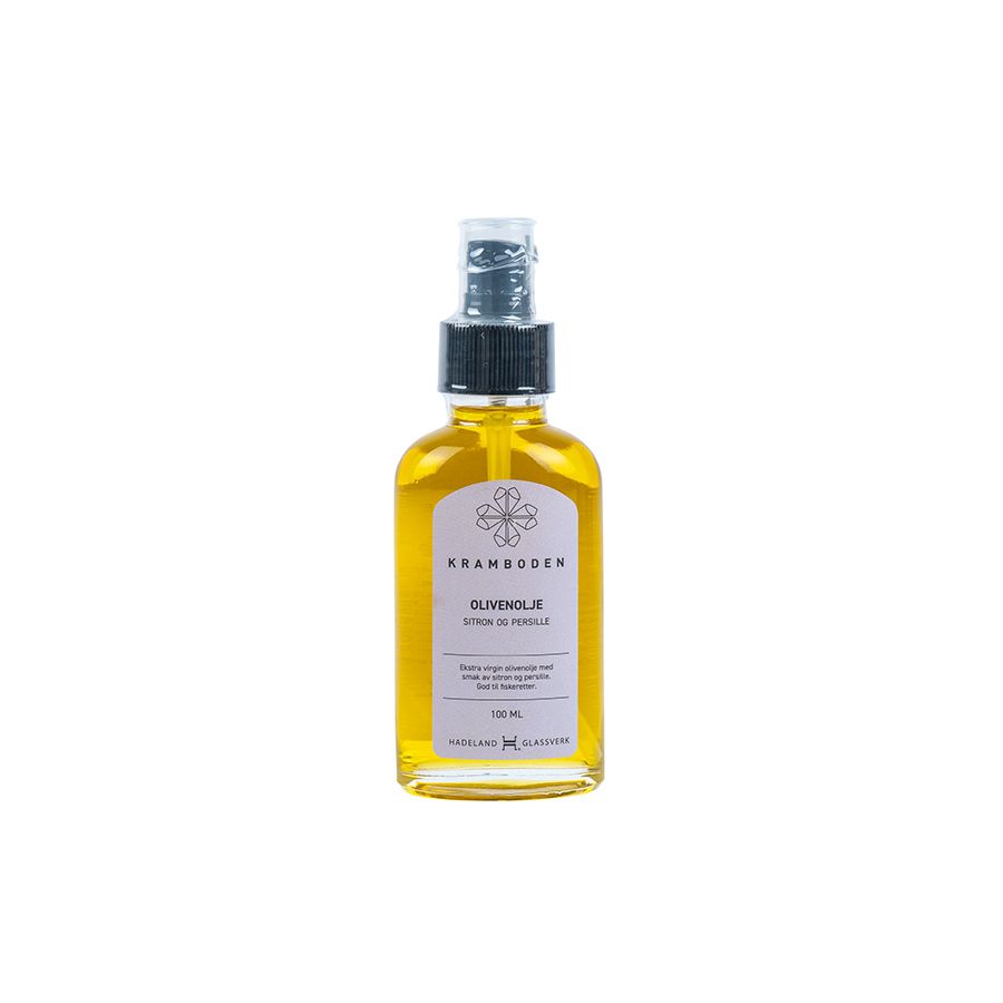 Ekstra virgin olivenolje på sprayflaske fra Kramboden. Oljen kommer med smak av sitron og persille, som gjør den utsøkt til fiskeretter. Flasken rommer 100 ml.