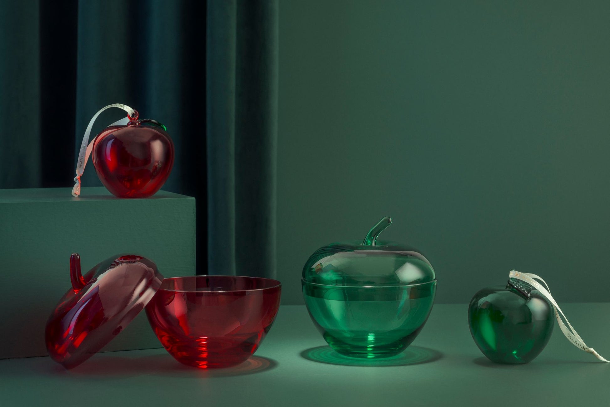 - 1 stk. Glasseple med lokk (rød eller grønn) – en elegant skål ideell for julegodt, nøtter eller småsnacks, som tilfører bordet både praktisk funksjon og tidløs skjønnhet.