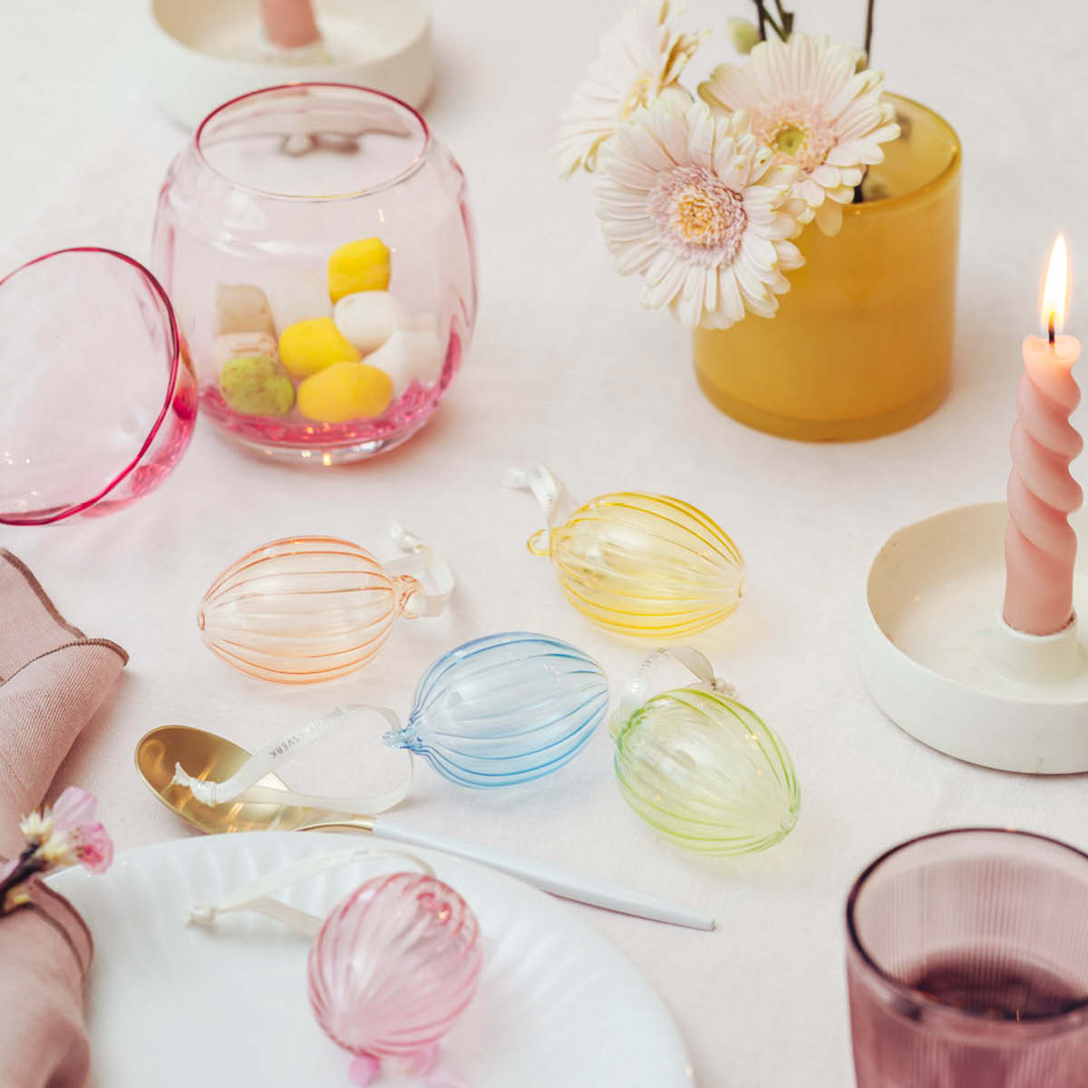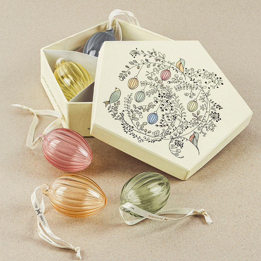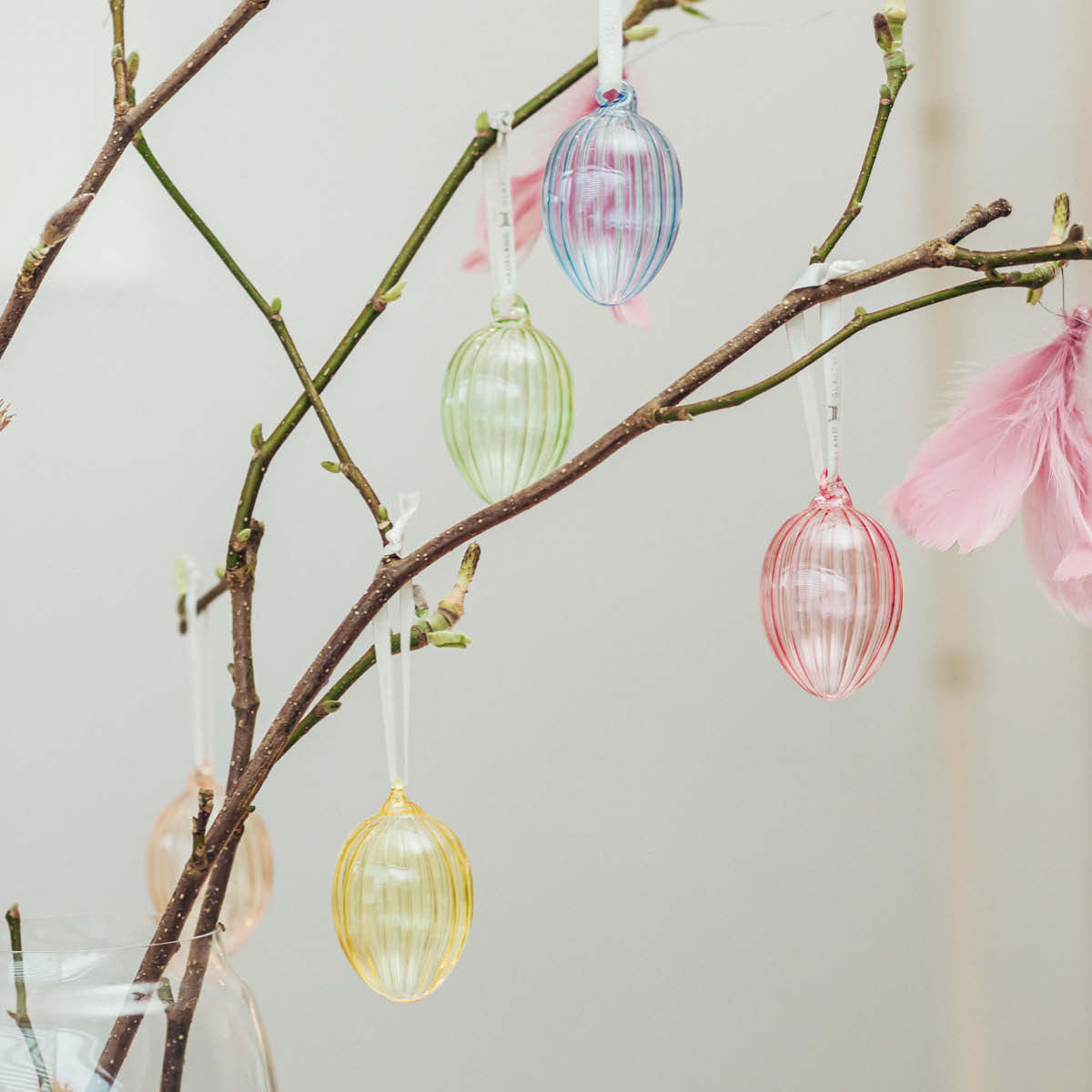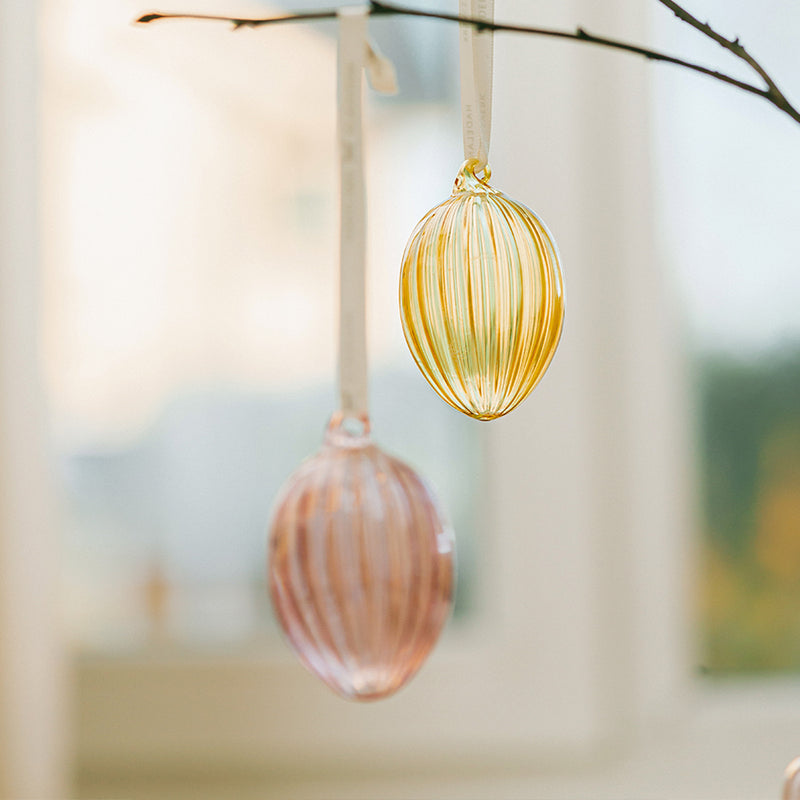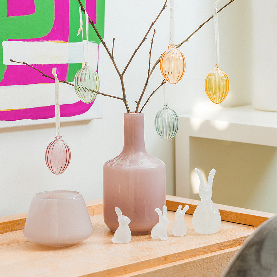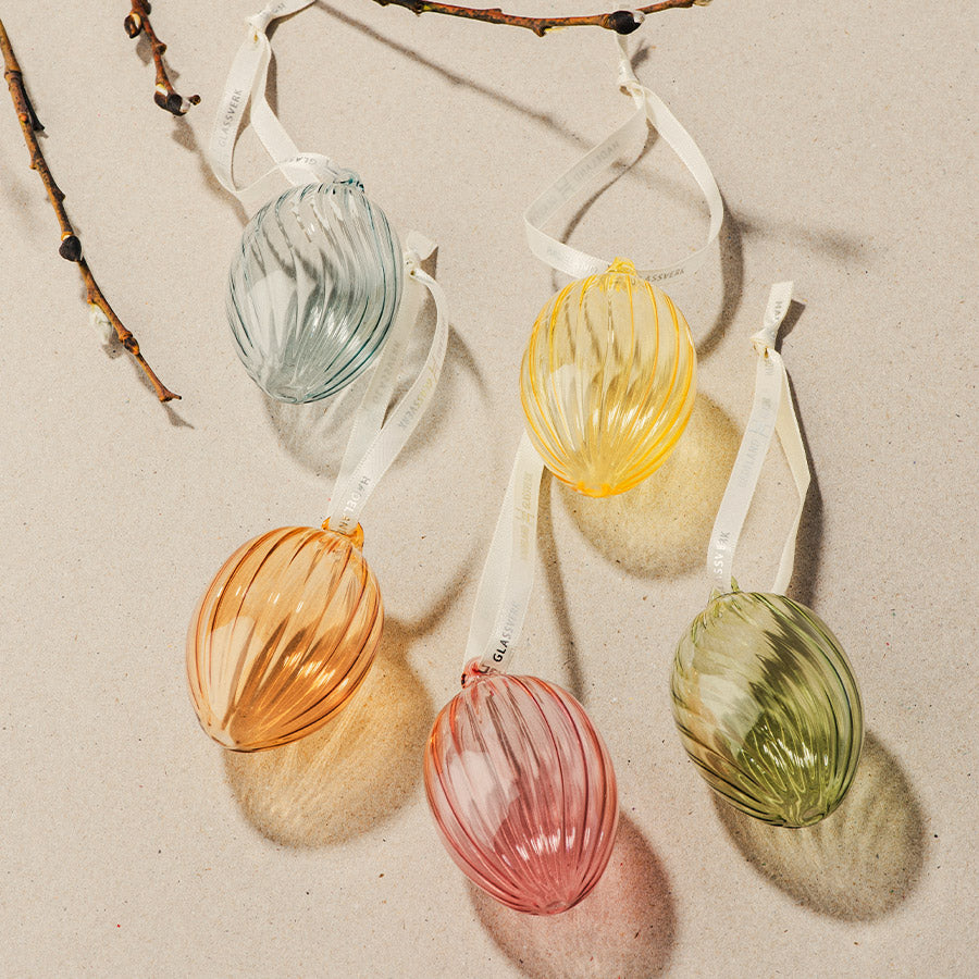 Disse hengende glasseggene i delikate pastellfarger har et dekorativt optikkmønster som fanger lyset på vakkert vis. Perfekte til å henge på kvister, i vinduer eller som en del av en påskeoppsats. Et lett og elegant uttrykk som gir rommet vårstemning.