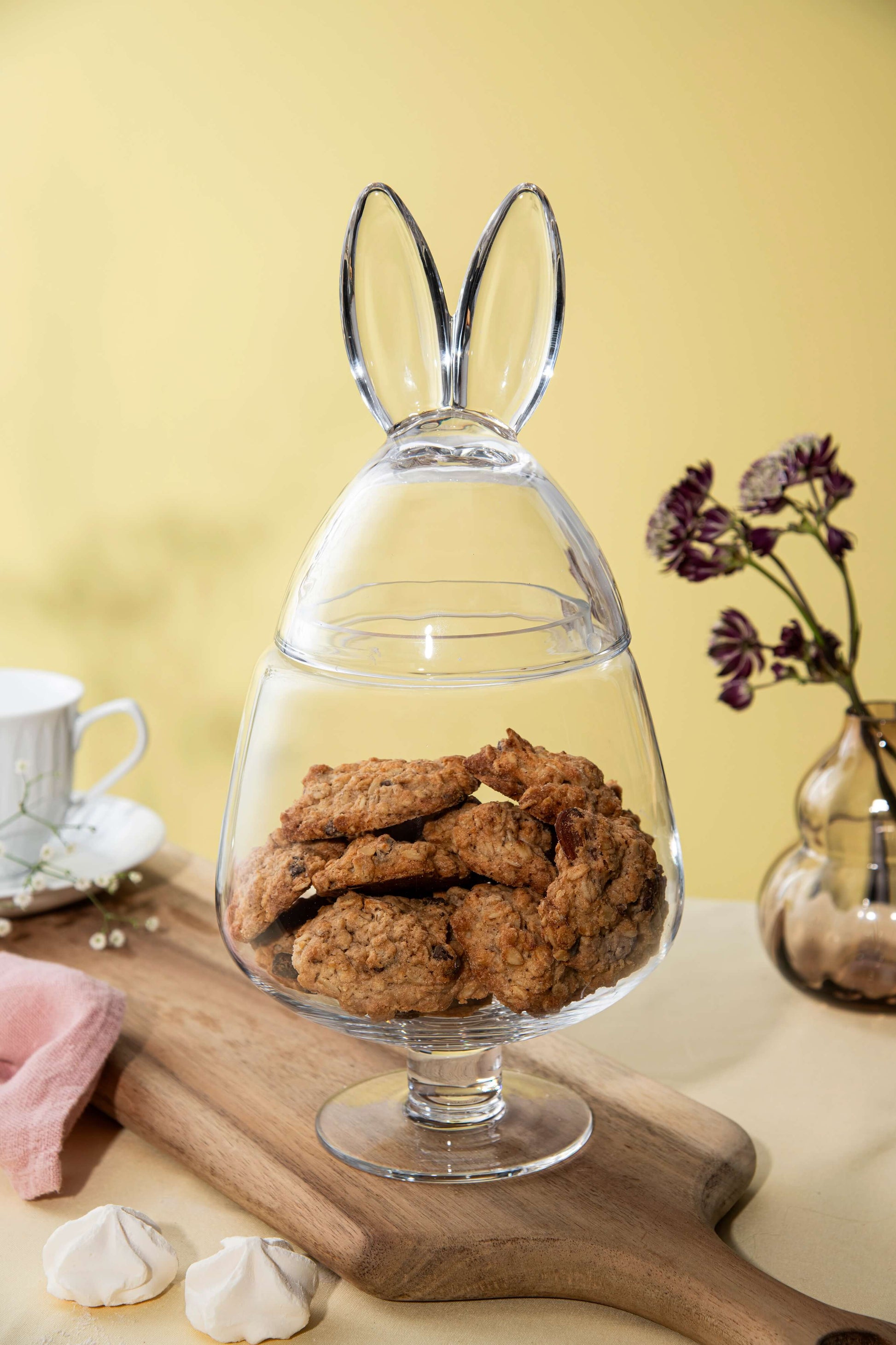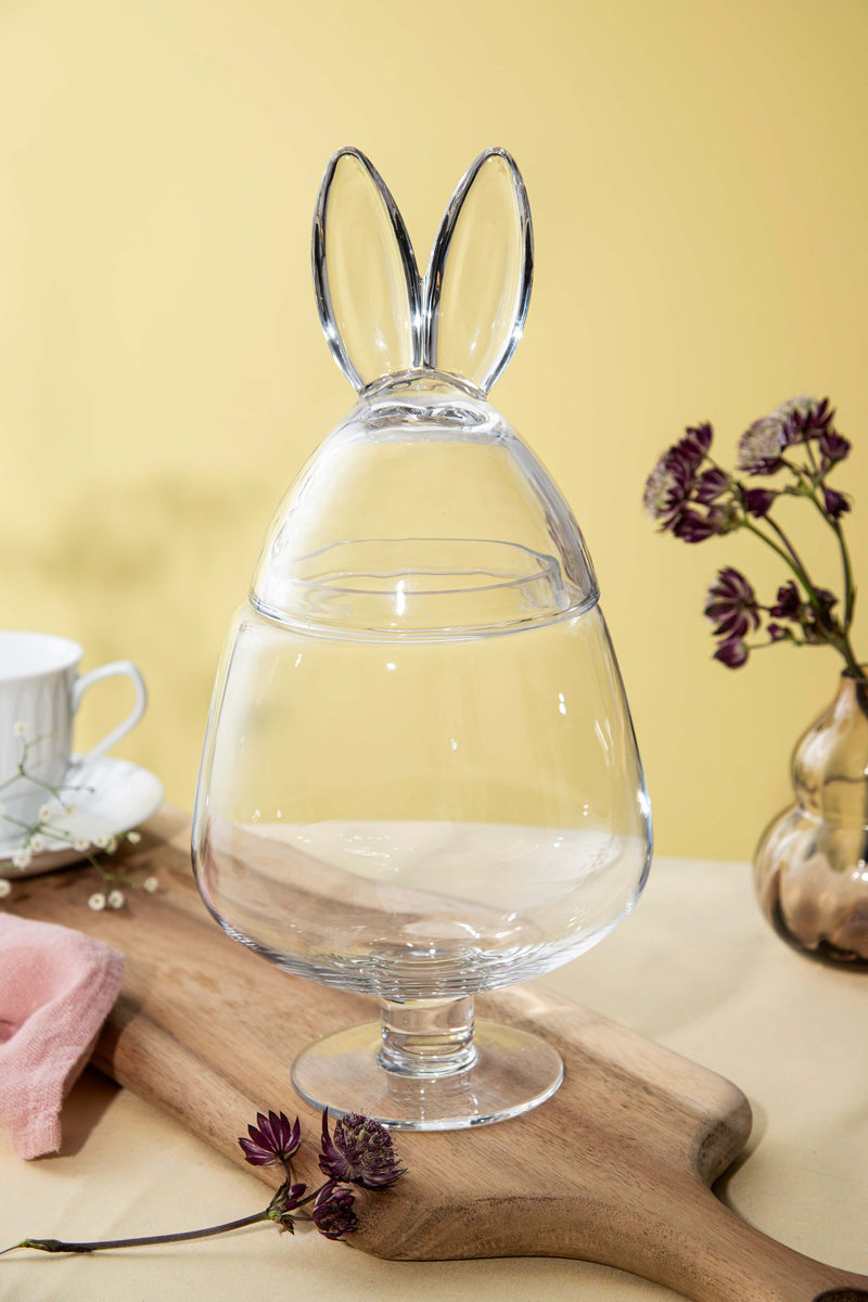 Et stort og dekorativt glassegg på stett, toppet med sjarmerende hareører. Et iøynefallende midtpunkt som kombinerer humor, eleganse og funksjon. Perfekt til påskegodt, småkaker eller som et markant dekorobjekt.