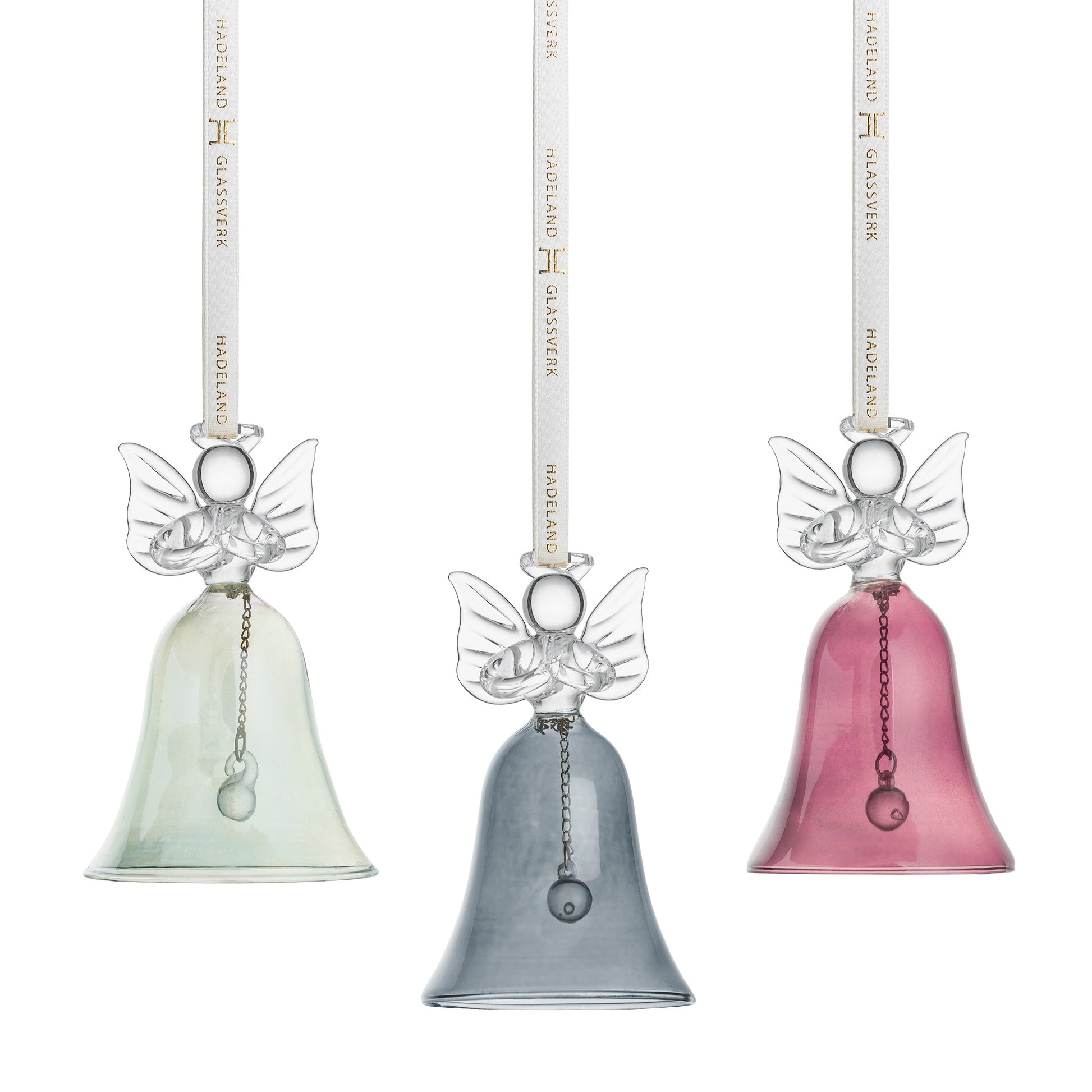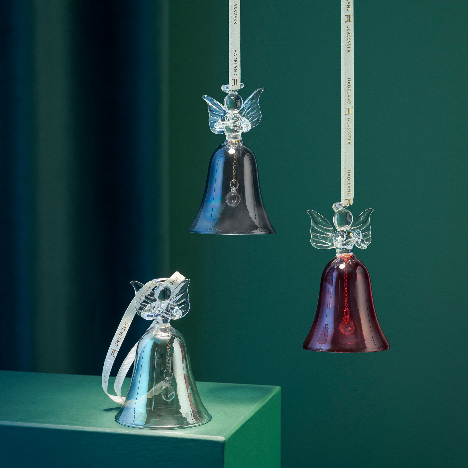 Glassengel Klokke 3 pk fra Hadeland Glassverk er en stemningsfull miks av engler i farget glass. Hver klokke er håndlaget og unik, med en liten bjelle som skaper en myk klang. De dempede fargetonene i rødt, grønt og grått gir et nostalgisk og varmt uttrykk – en vakker påminnelse om julens tradisjoner.