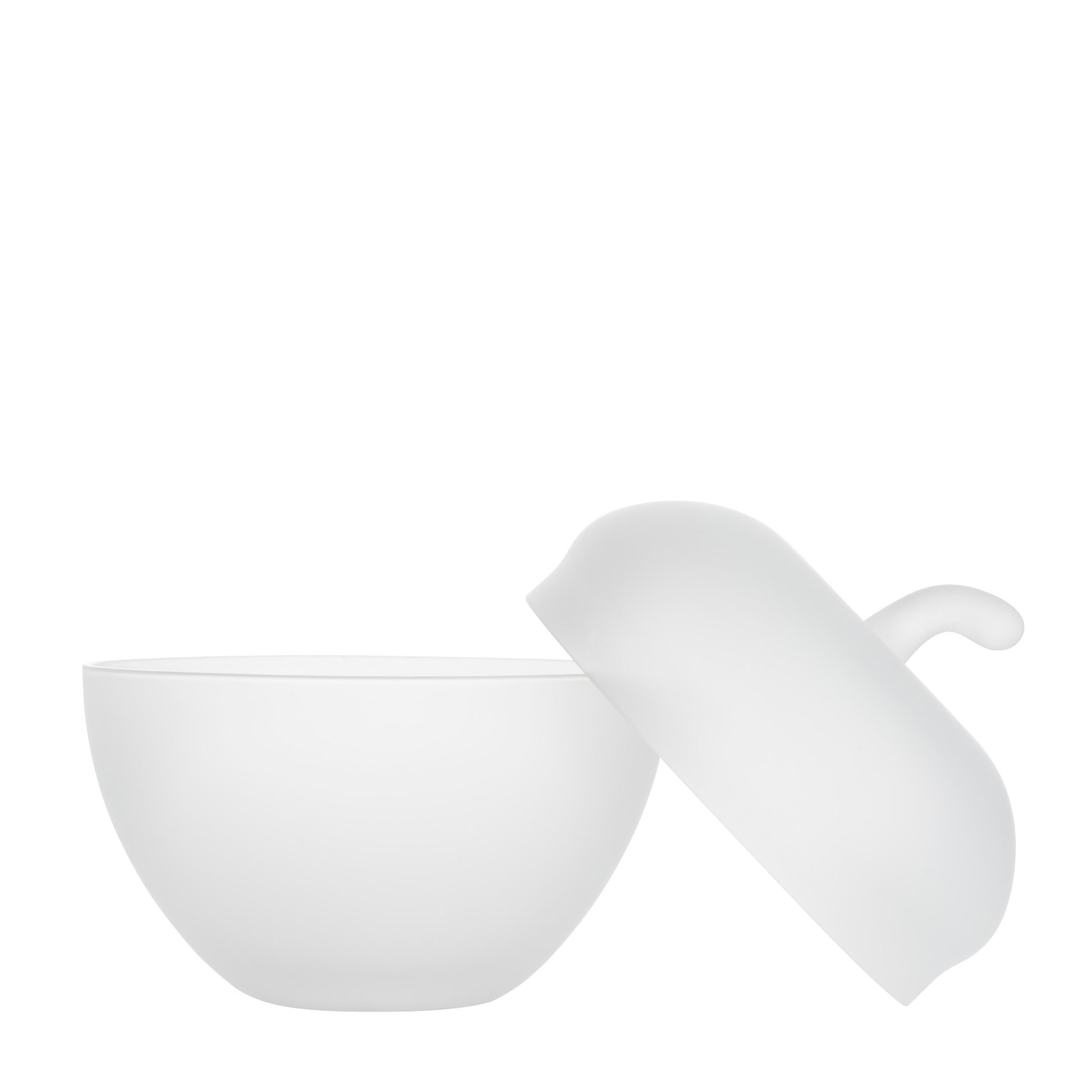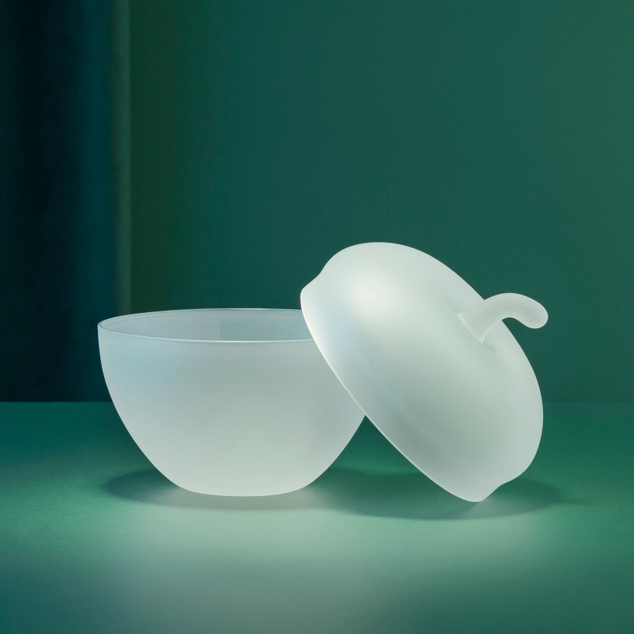 Glasseple med lokk i frostet hvitt glass fra Hadeland Glassverk er en moderne klassiker. Den frostede overflaten gir et rolig og sofistikert uttrykk, mens den matte hvittonen skaper et vakkert spill i lyset. Perfekt som dekorativ oppbevaring eller gave. Bruk den alene eller sammen med rosa og grønne varianter for et harmonisk uttrykk.