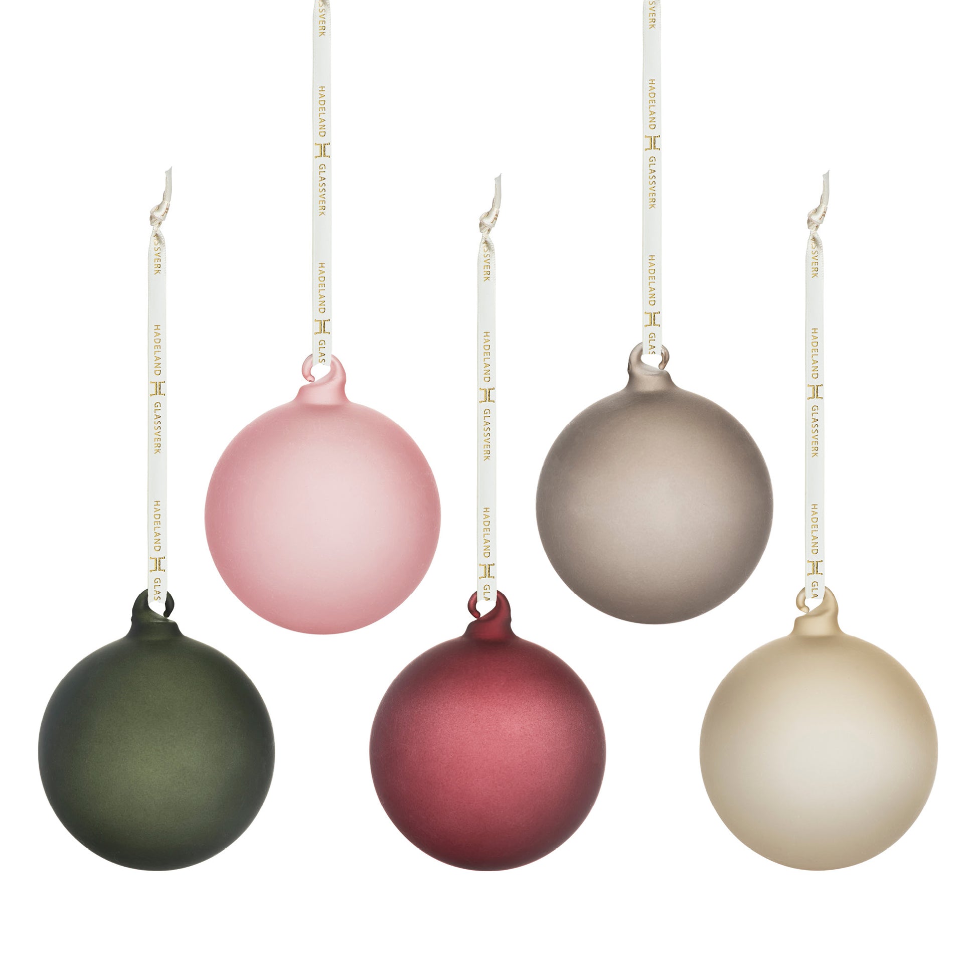 Glasskuler Frostet 5 pk fra Hadeland Glassverk er en moderne tolkning av klassisk julepynt. Kulene i frostet glass kommer i duse nyanser som grønn, rød, rosa og beige – perfekt for å skape en rolig og elegant julestemning.