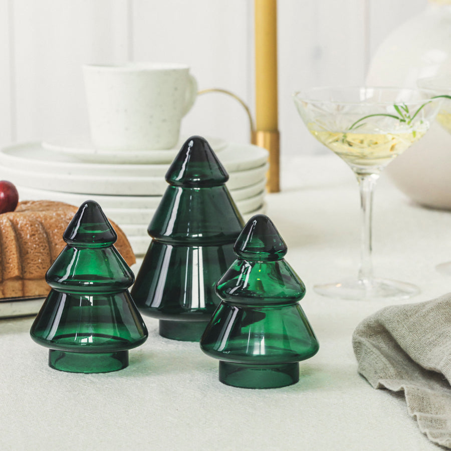 Den dype grønntonen tilfører en frisk og naturlig stemning, mens glasset skaper et stemningsfullt lysspill med LED-stearinlys. Med sitt elegante format fungerer det perfekt som midtpunkt på bordet, eller sammen med de mindre grantrærne for en helhetlig dekorasjon.