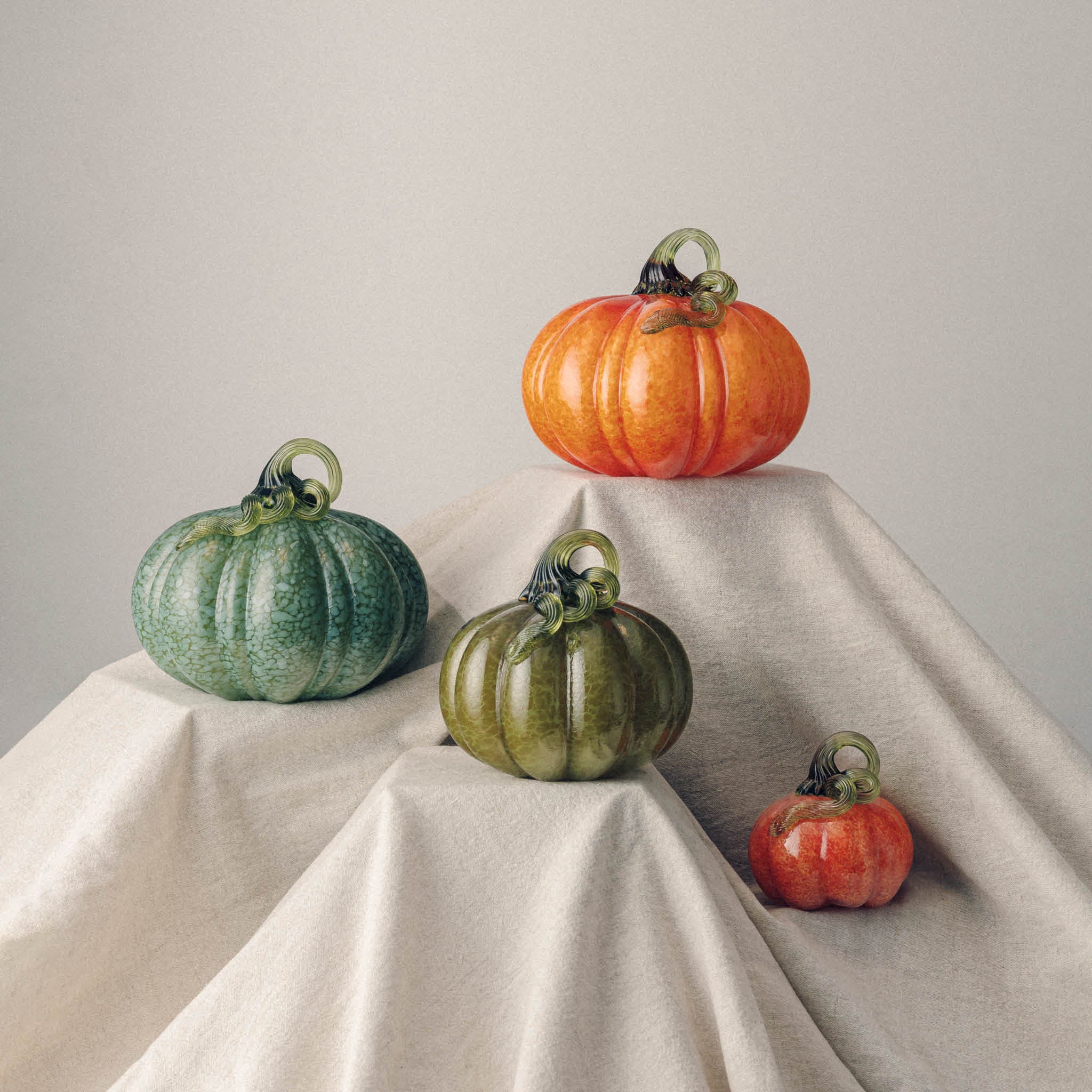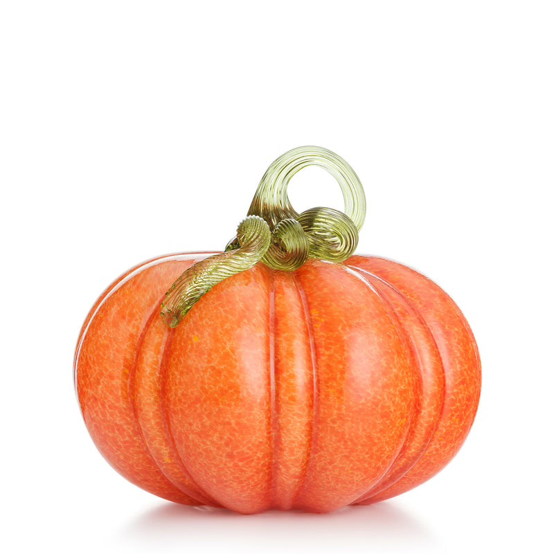 Munnblåst gresskar i varm oransje farge med grønn stilk. Unikt håndverk som gir et markant og stemningsfullt uttrykk.