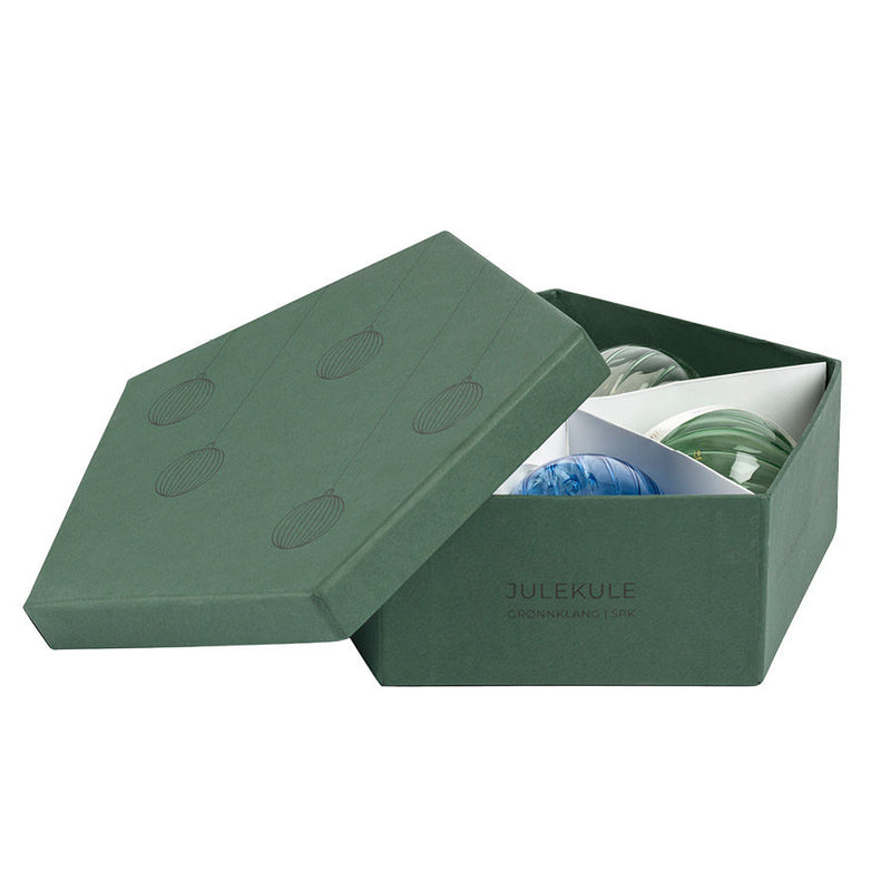 Grønnklang er en kolleksjon med fem munnblåste julekuler i glass. Glasskulene kommer i fem farger, fra iskald gråblå til varm grønn, vakre fargetoner i blått og grønt, med inspirasjon fra is og vinterskog. Grønnklang leveres delikat innpakket i en lekker eske, noe som gjør den til den perfekte gaven! Kulene er aller vakrest når de henger samlet, så heng dem på treet, på en gren eller i vinduet, for en god og gammeldags julestemning med et moderne uttrykk.