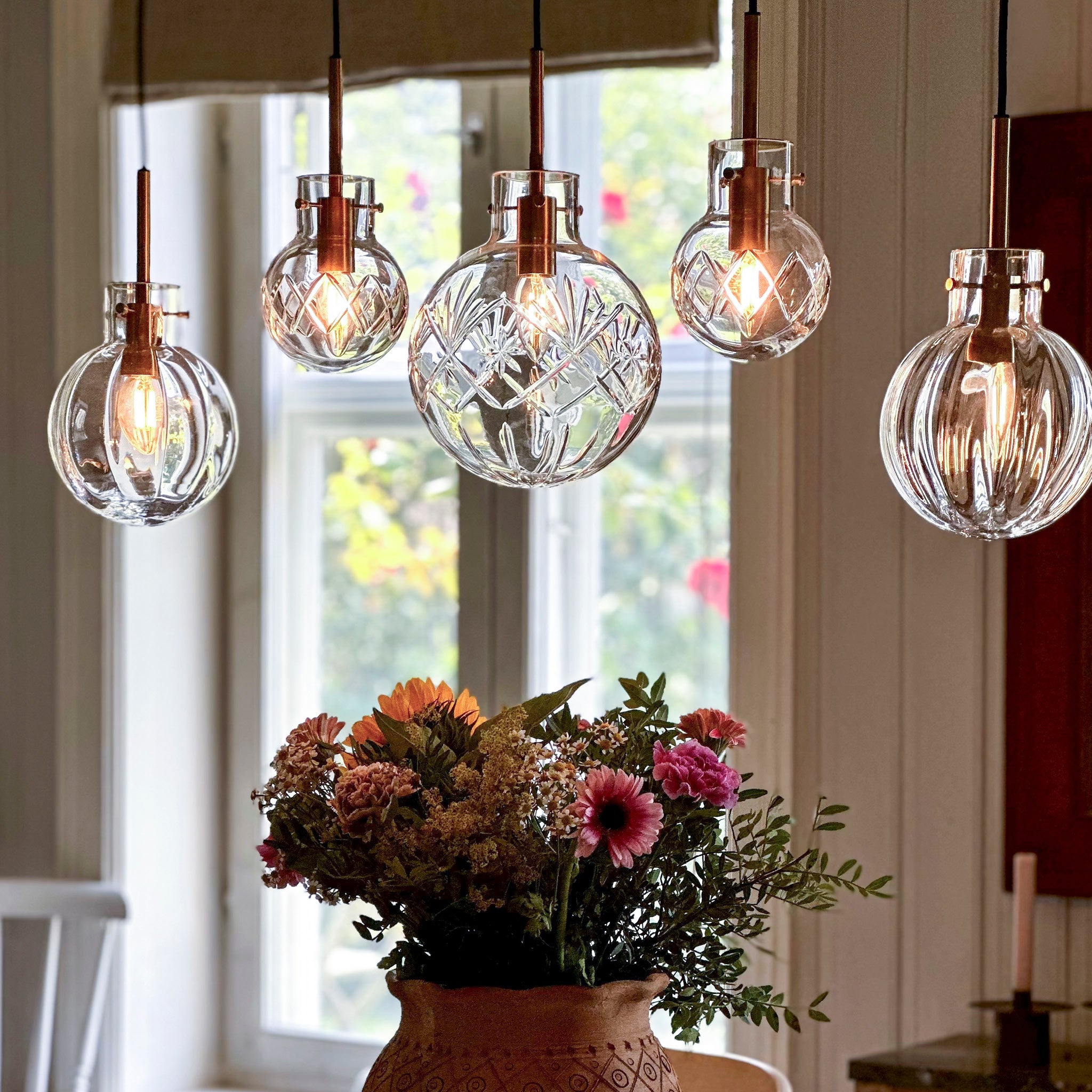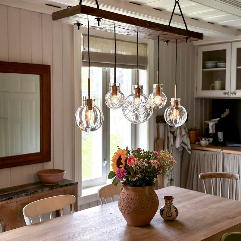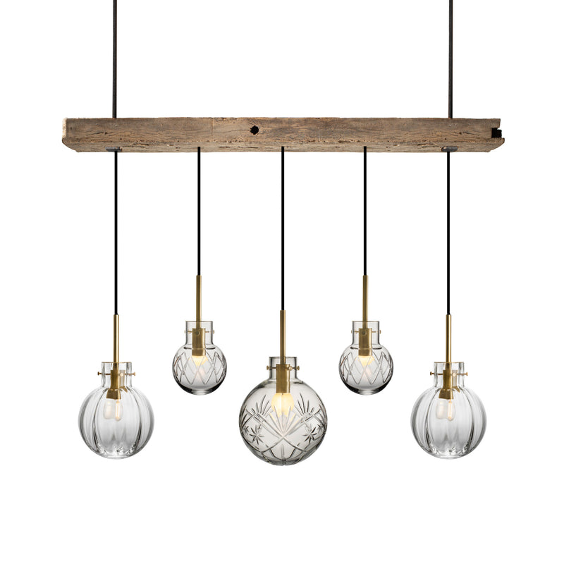 Krystallklar er en eksklusiv lampesammensetning, og består av fem unike krystallkuler i forskjellige mønstre og størrelser – et uttrykk for håndverk, historie og moderne eleganse i perfekt balanse.