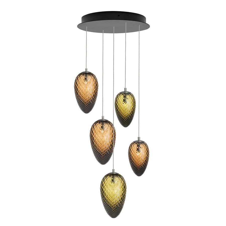 Inneholder 5 munnblåste kongler i en spennende kombinasjon, i størrelsene 17cm, 21cm og 23cm i kakao og 17cm og 23cm i oliven.