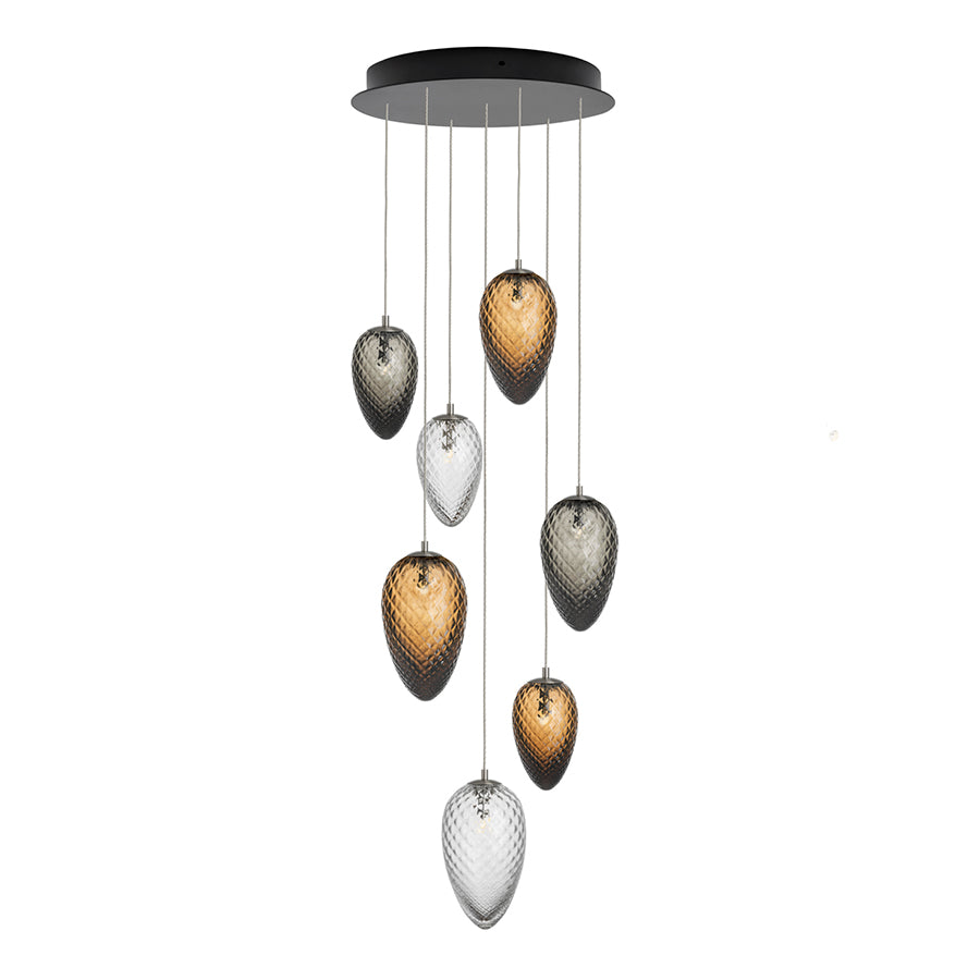 Inneholder 7 munnblåste kongler, i størrelsene 17cm, 21cm og 23cm i kakao, 17cm og 23cm klart glass og 17cm og 23cm røkgrå.